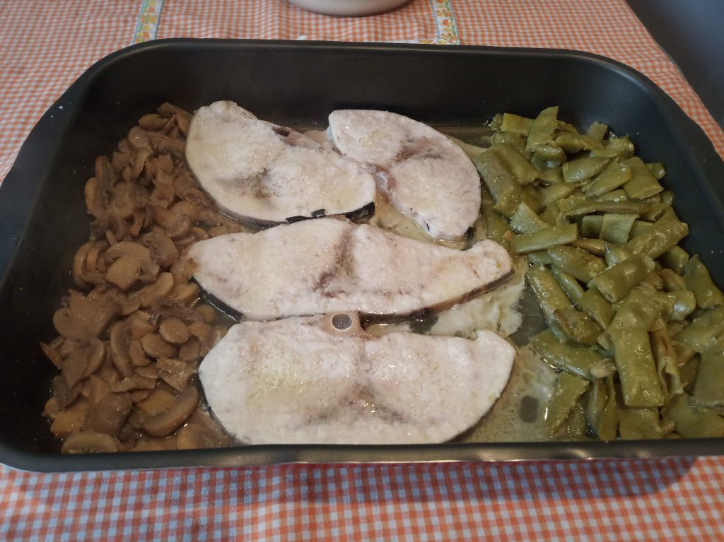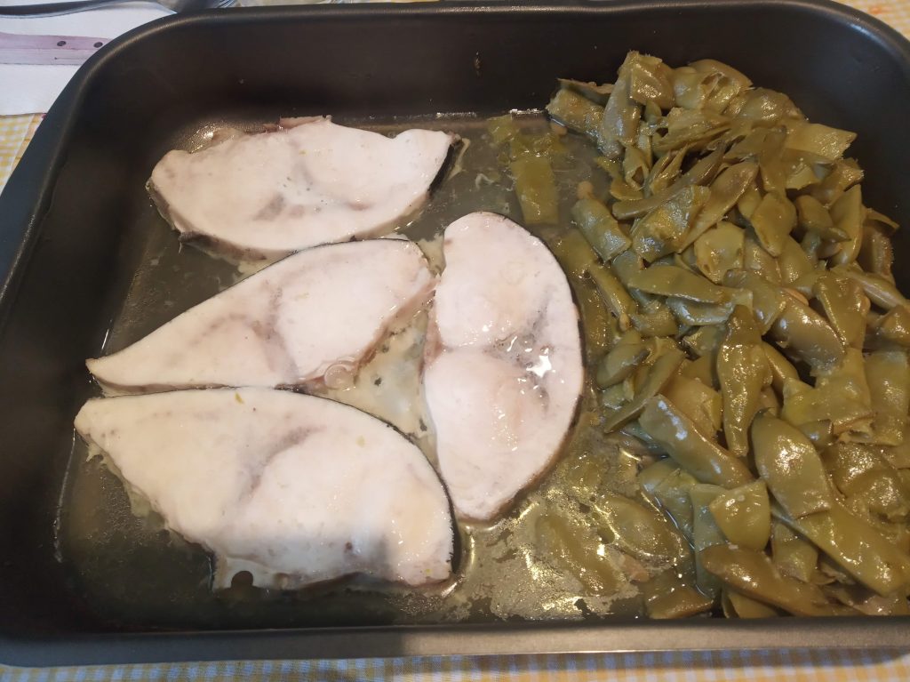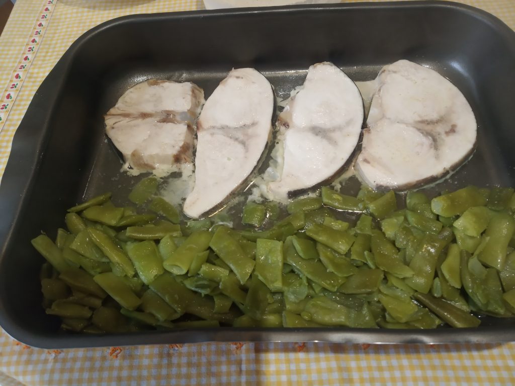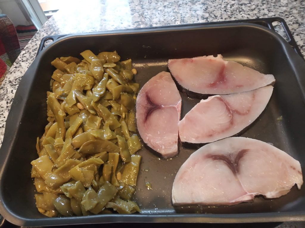 Echar los 2 botes de judías verdes, en un colador, pasar bajo el grifo y bien escurrido, lo echamos en el otro lado de la fuente, donde está el pescado. Echarle un poco de aceite, sal y ajo en polvo, mezclar muy bien.