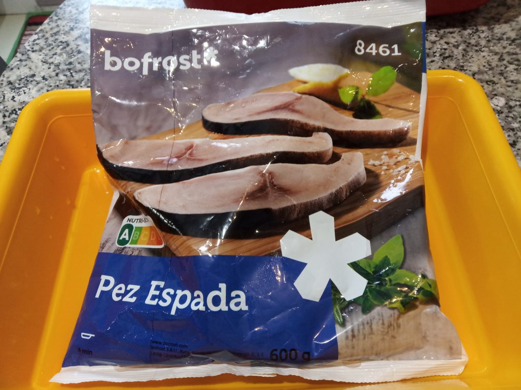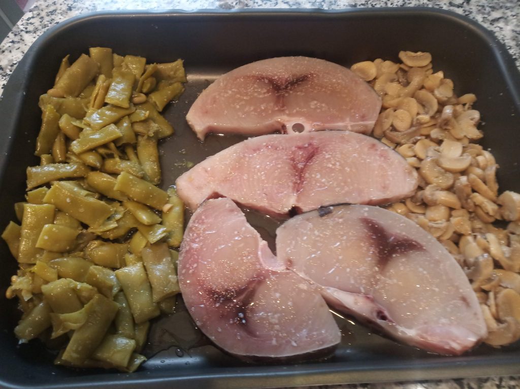 Echamos un poco de aceite, repartir bien. Echar sal al pez espada y colocarlo en la bandeja, en un lado.