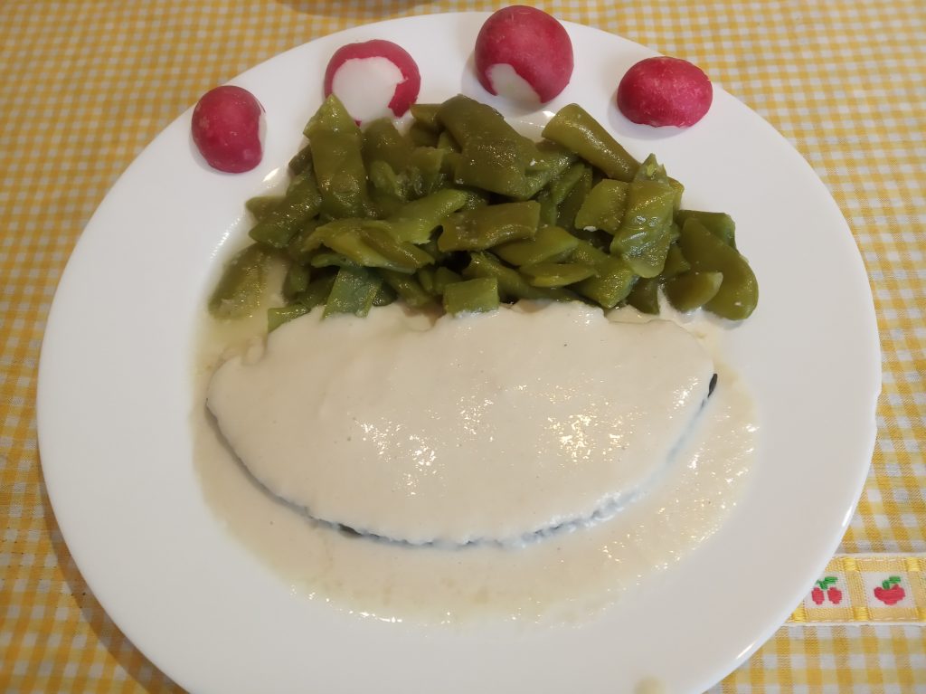 Servir en plato llano y echar por encima del pescado, la salsa de almendras.