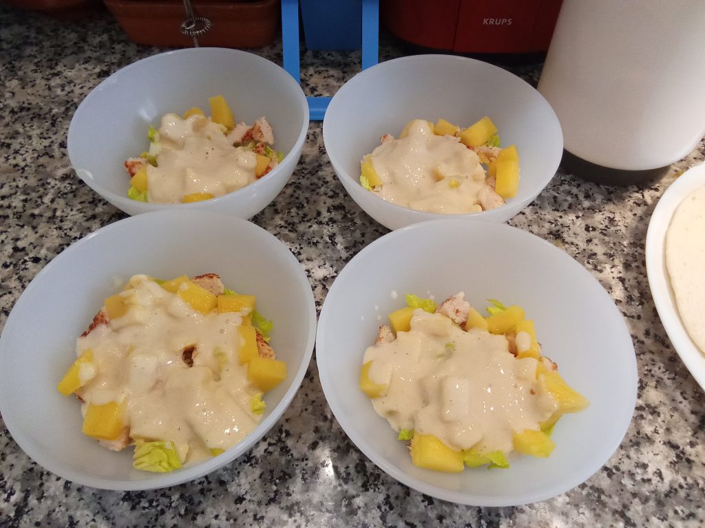 Repartir en 4 cuencos, la lechuga, el pollo, el mango y la salsa de yogur, mezclar todo muy bien.