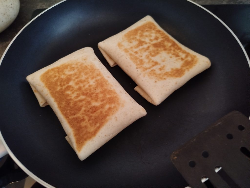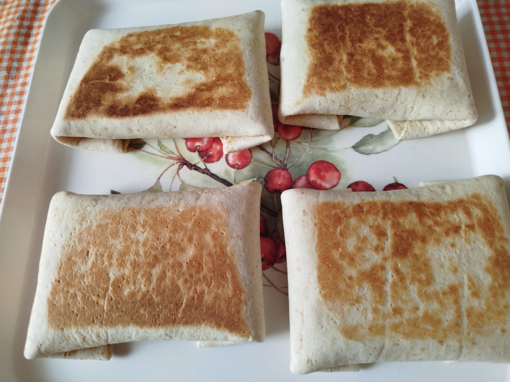 Repartimos, encima de cada Piadina, la mezcla del cuenco, cerramos los lados, y luego enrollamos, hasta quedar el cierre abajo, así con las cuatros Piadina.