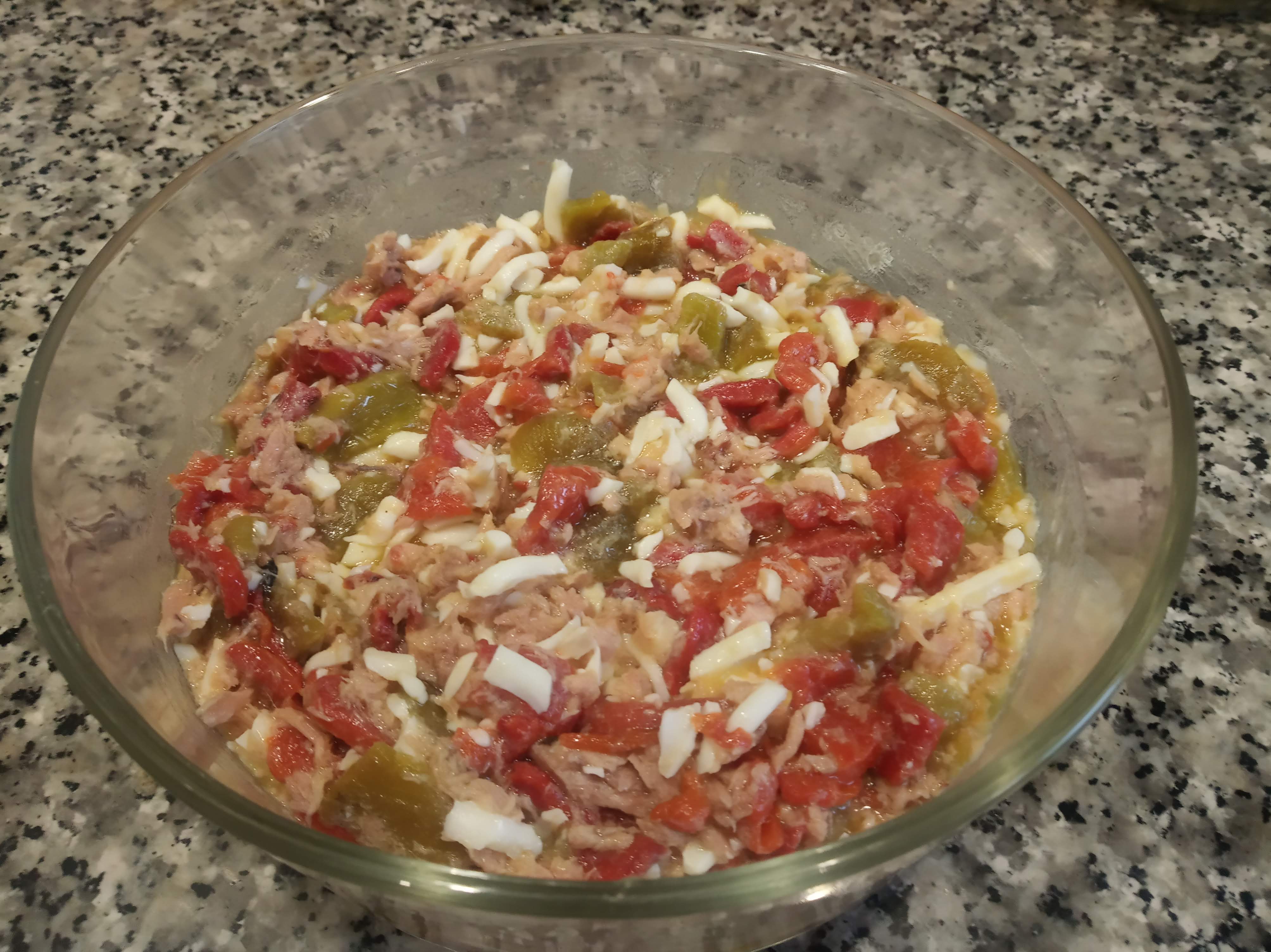 Poner en un bol de cristal los pimientos, añadir el atún desmenuzado con su aceite al ser de oliva, pelamos los huevos y rallamos por la parte gruesa del rallador, también puedes cortarlos a cuchillo.