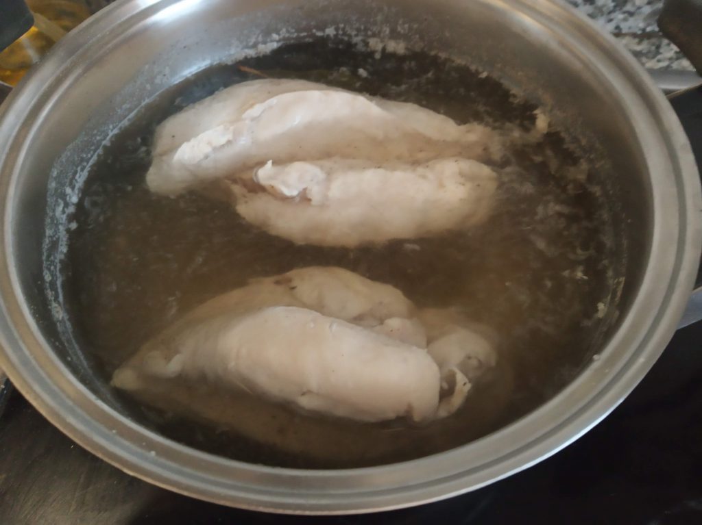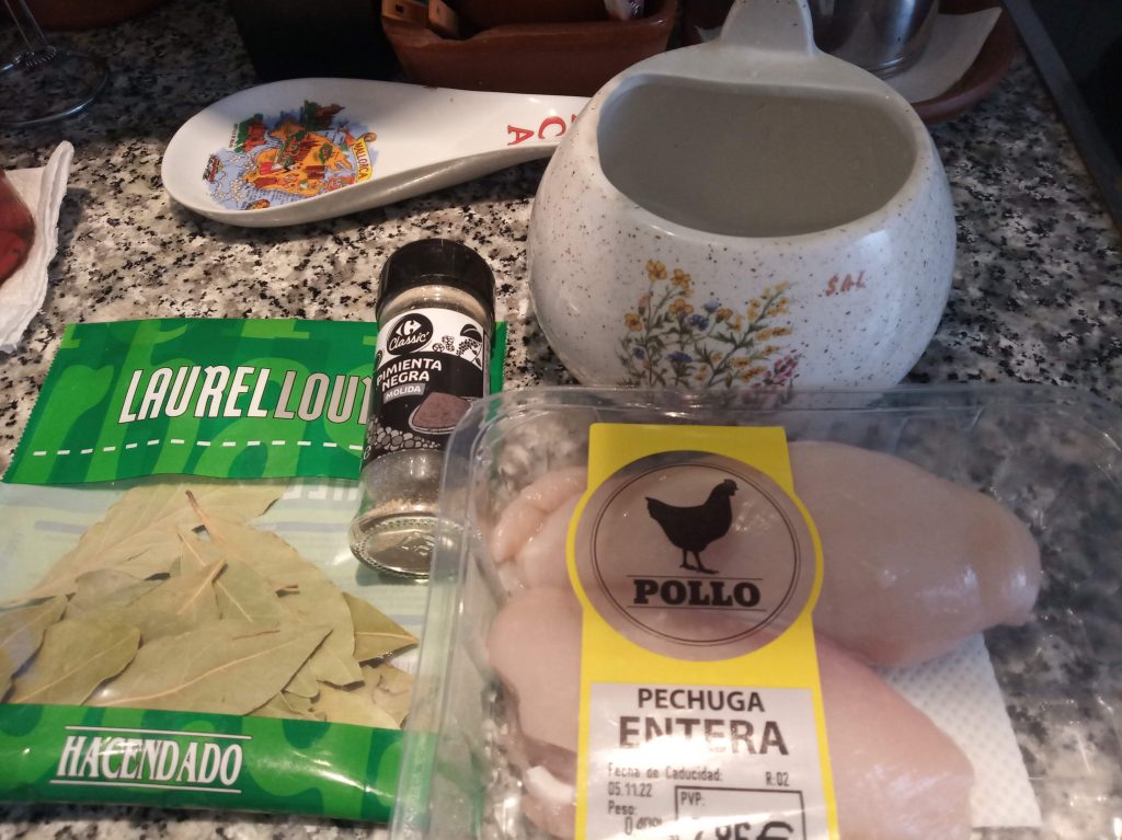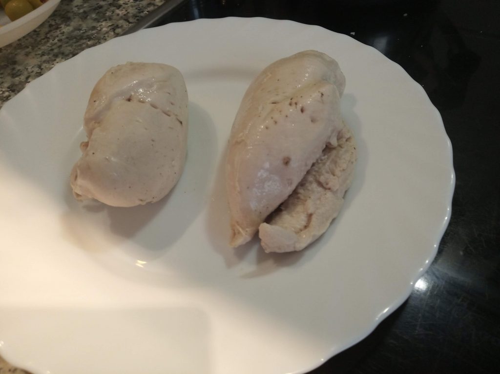 Echamos 3 vasos de agua en una cacerola y cuando empiece a hervir, le echamos el laurel, sal, pimienta y la pechuga de pollo. Dejamos cocer unos 10 minutos, sacamos para enfriar. Reservamos. En mi caso tenía 2 pechugas, una la he guardado ya cocida y fría, en un táper y congelado, para otra receta.
