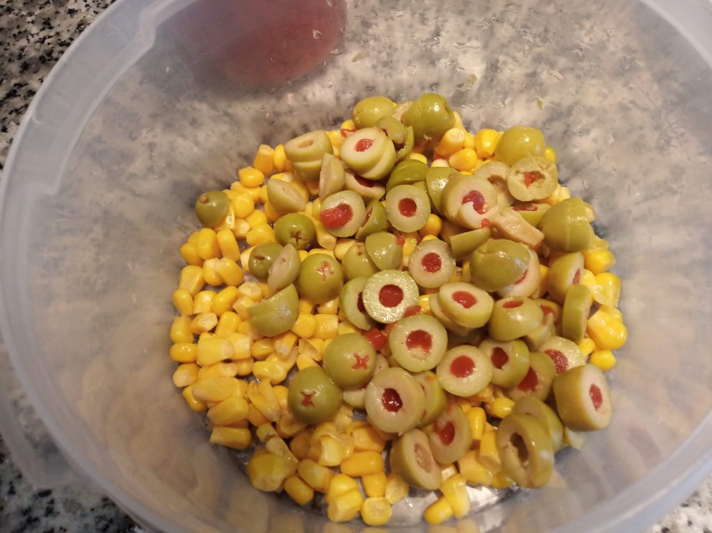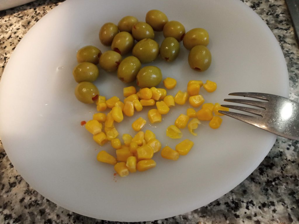 Ir poniendo en un plato o bandeja, y echar por encima las aceitunas enteras y el maíz, reservado.