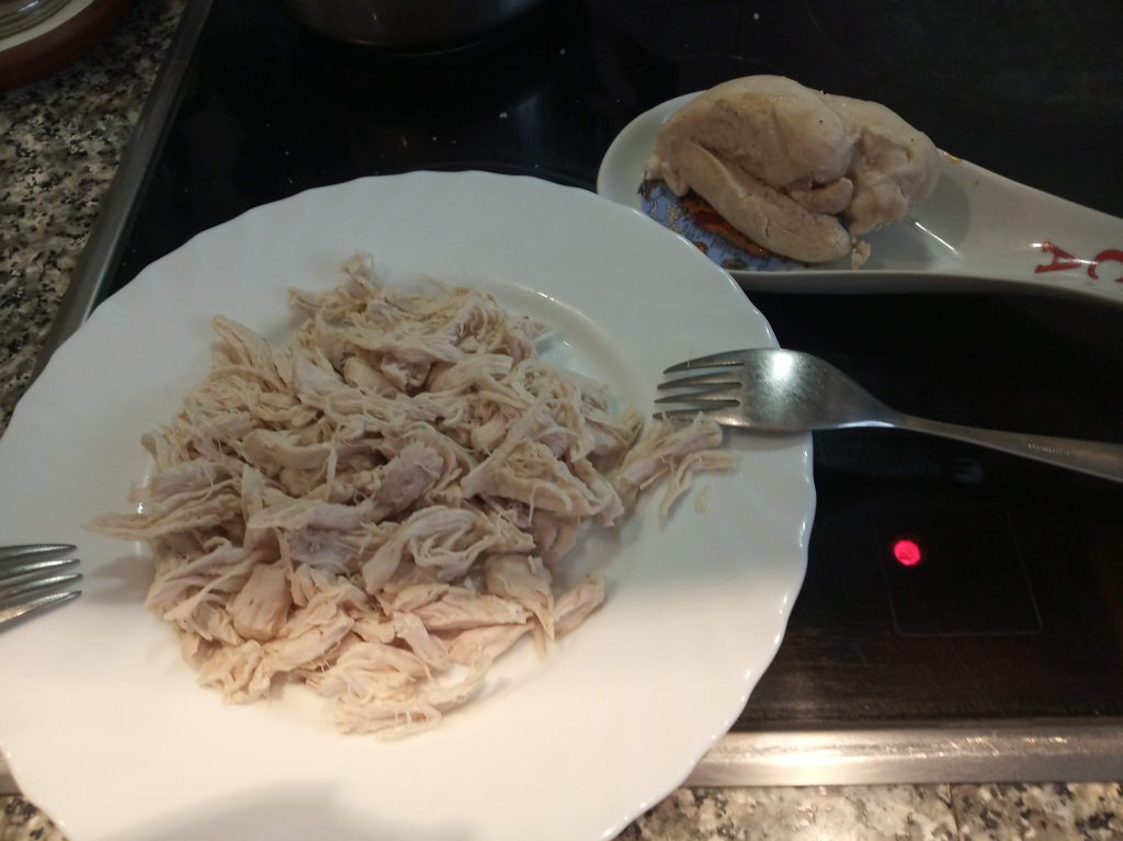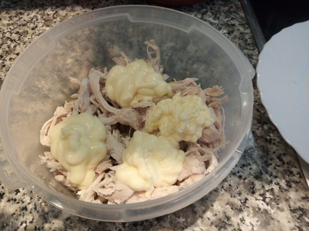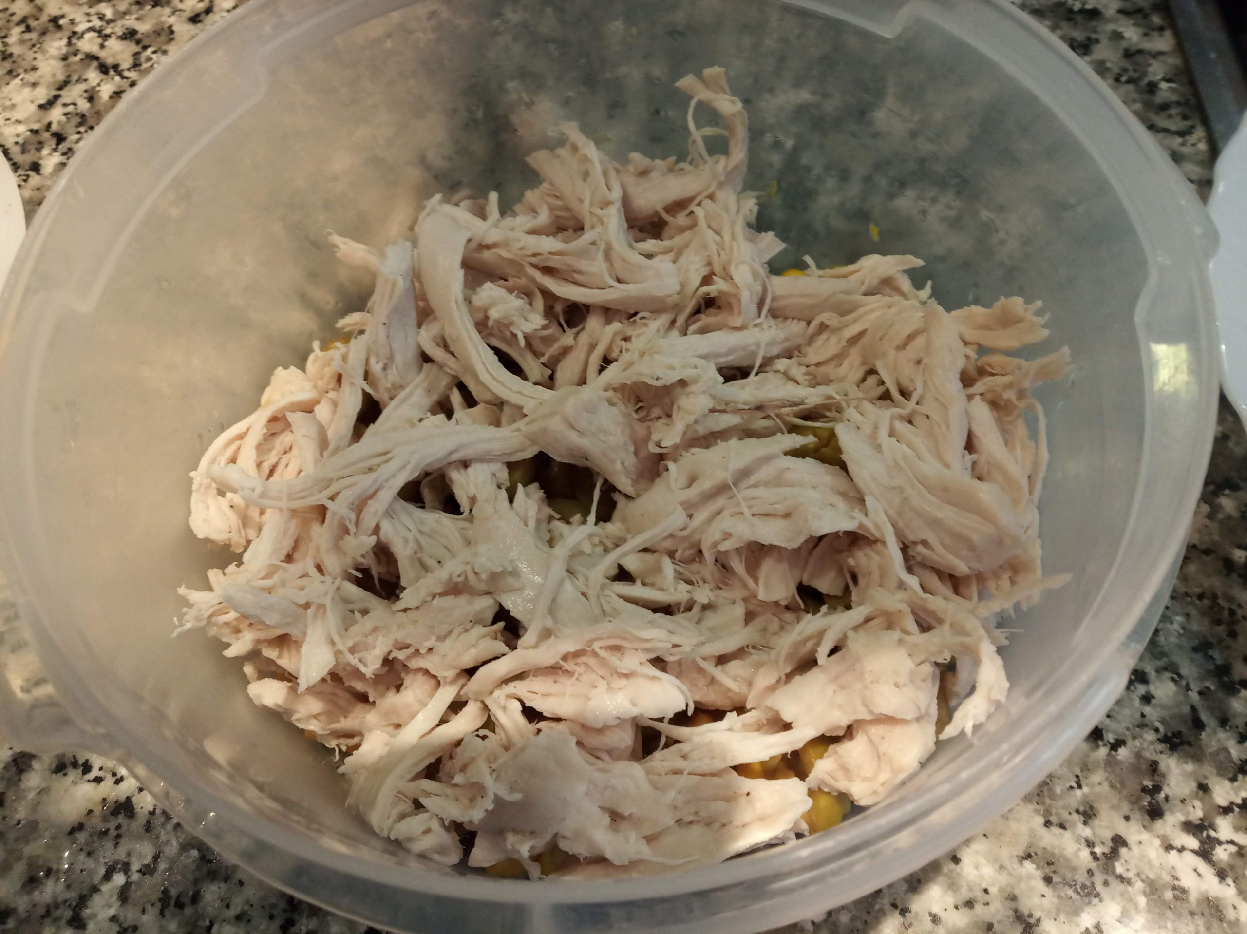 Desmenuzamos la pechuga de pollo y la añadimos al bol.
