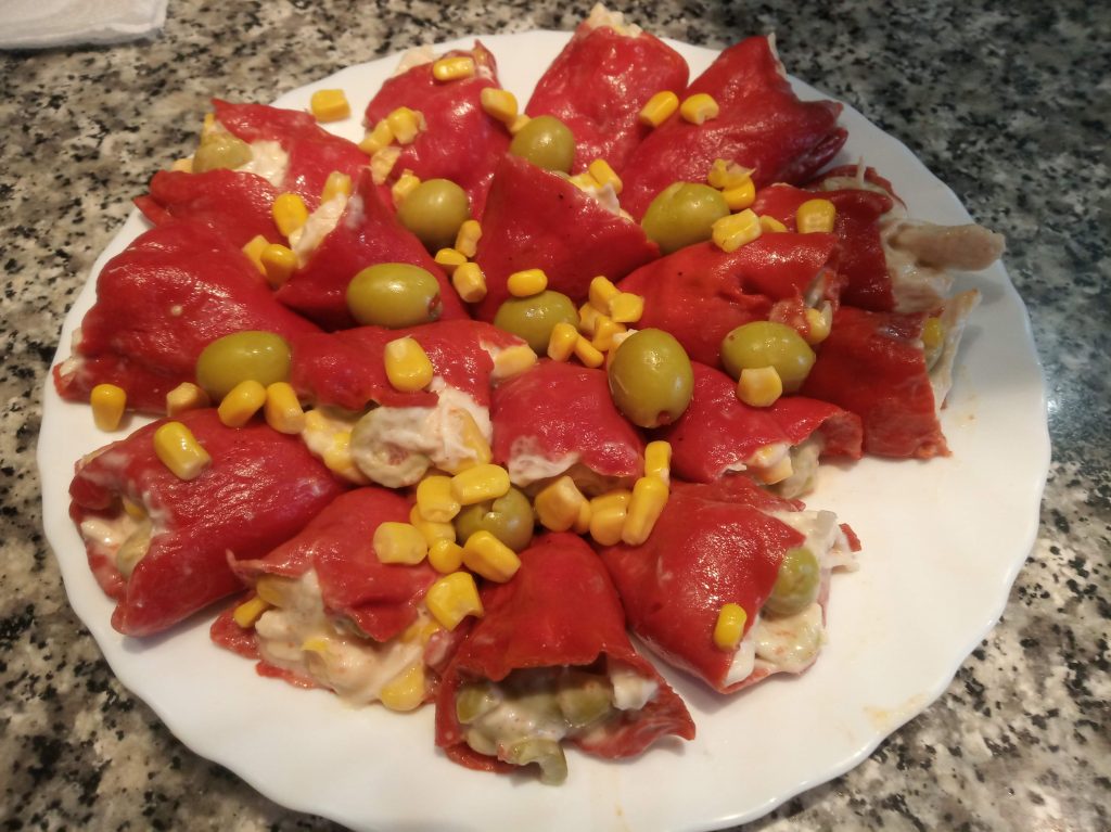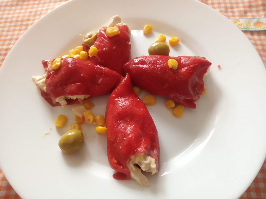 Dependiendo del tamaño de los pimientos, emplatar, 3 ó 4 por personas, con unas aceitunas y maíz.