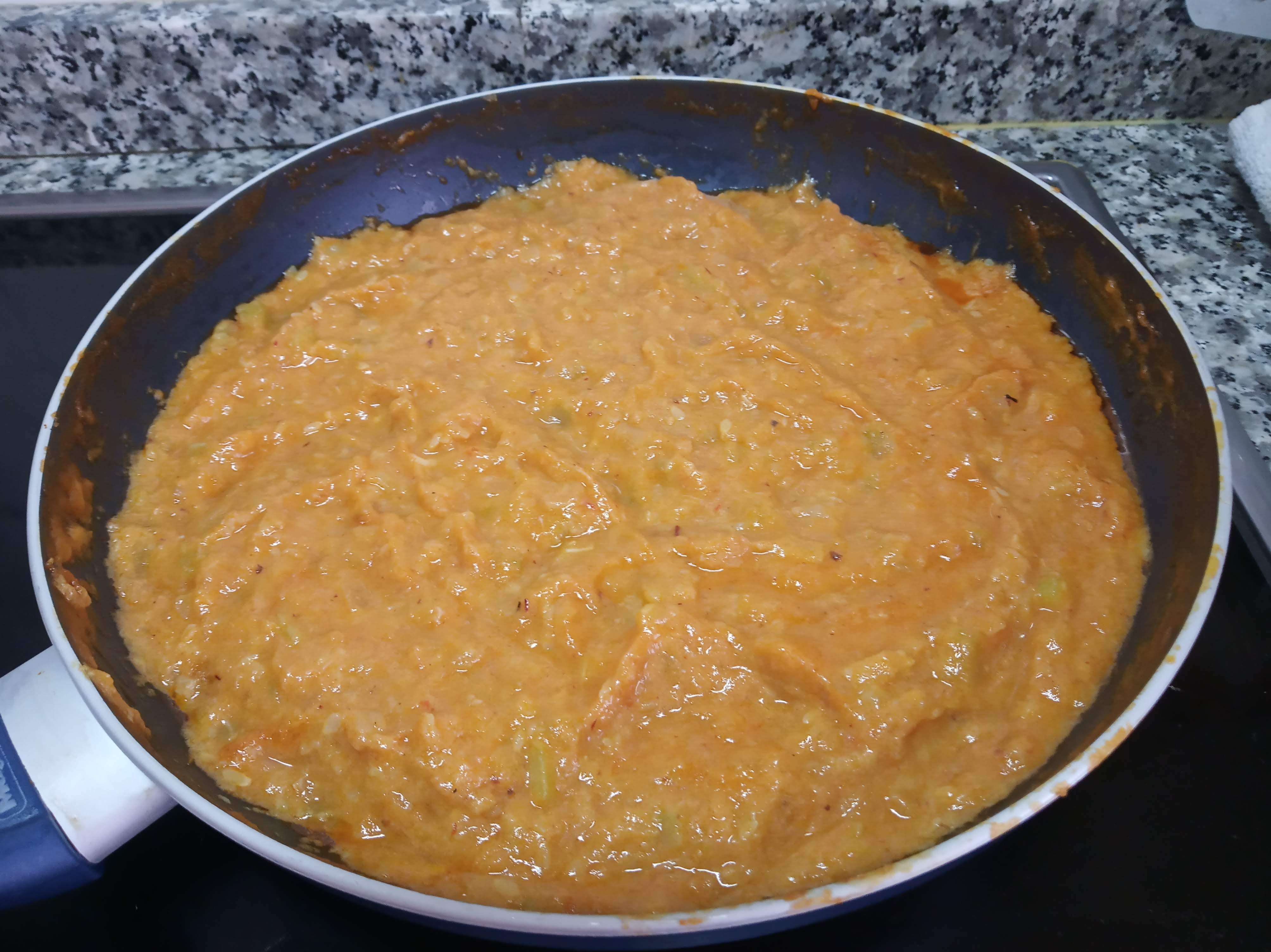 Añadir la carne de los pimientos choriceros y el tomate frito, mezclar todo muy bien, y dejar hasta que empiece a hervir.