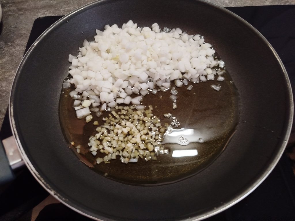 En una sarten grande, echamos un poco de aceite, la cebolla y los ajos picados, cuando estos empiecen a hervir, mezclar todo muy bien, con un poco de sal, para que suelte el agua.