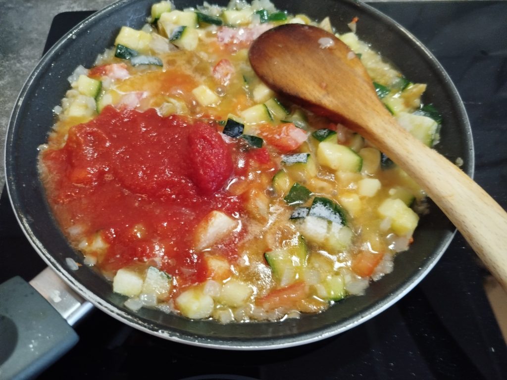 Añadir el resto de la verdura y el tomate si es natural, dejar hacer hasta que la verdura este tierna.