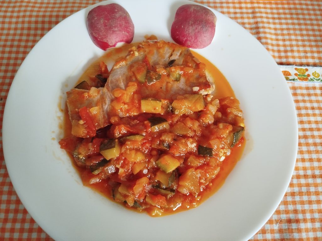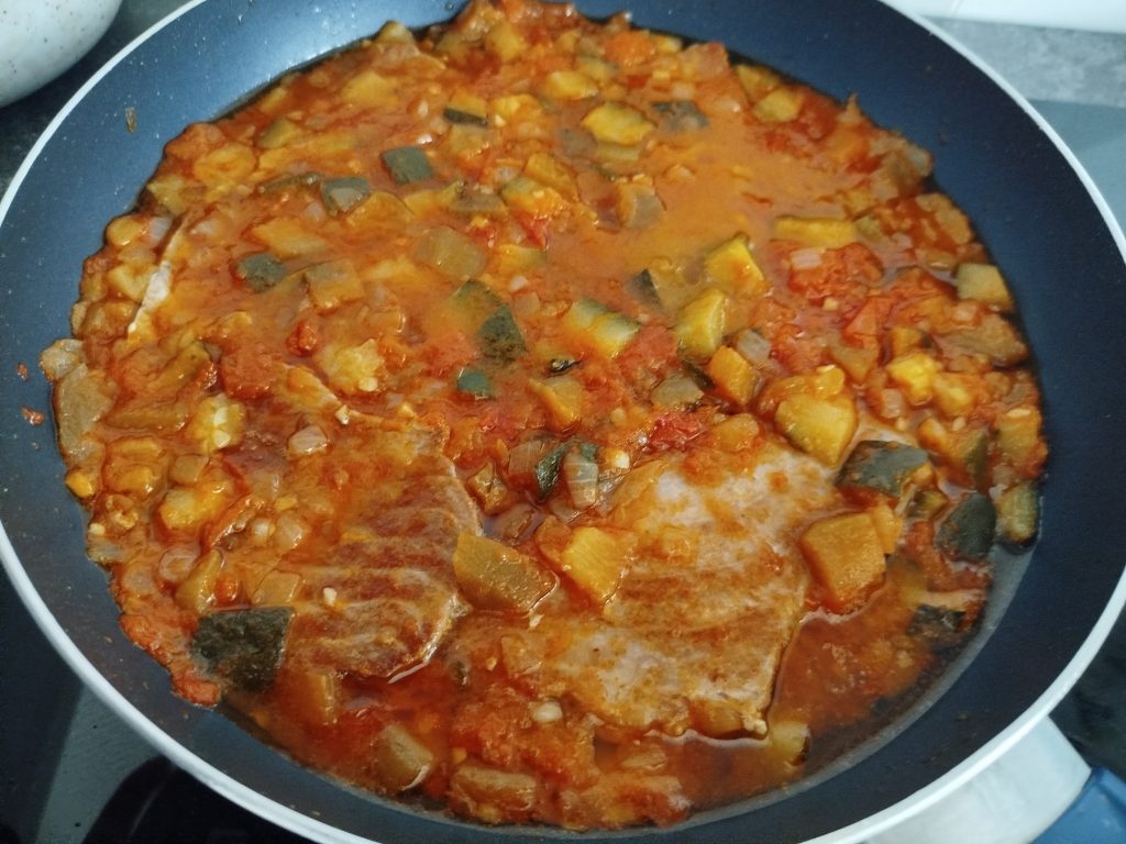 En una sarten grande, eche un poco de aceite, y marque a fuego fuerte el atún, baje el fuego y le añadí, el pisto, dejar unos minutos, cuando empiece a hervir, y servir.