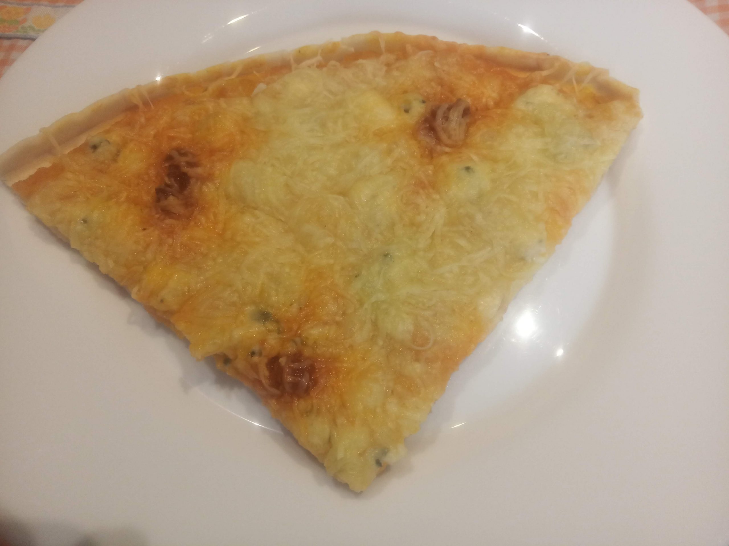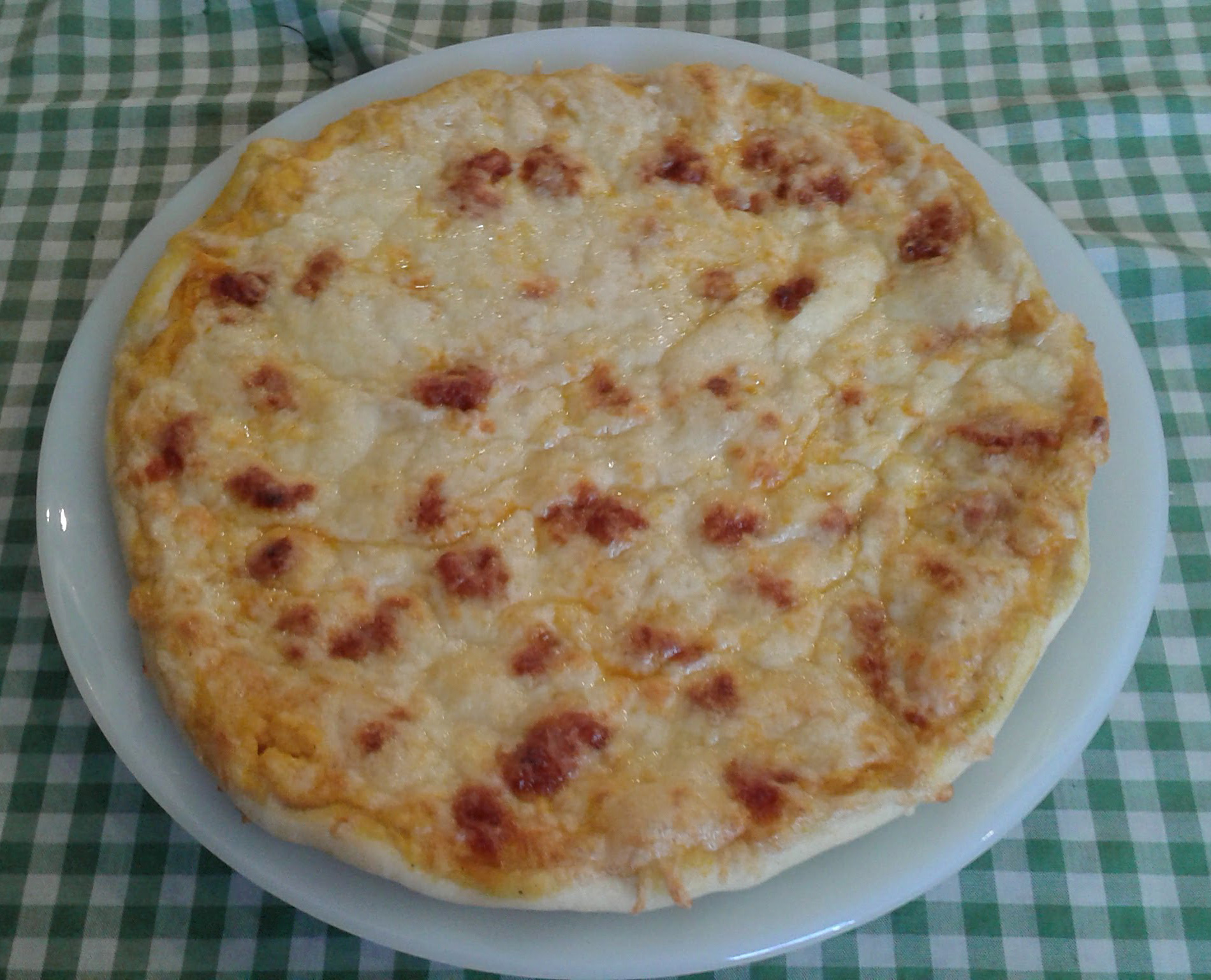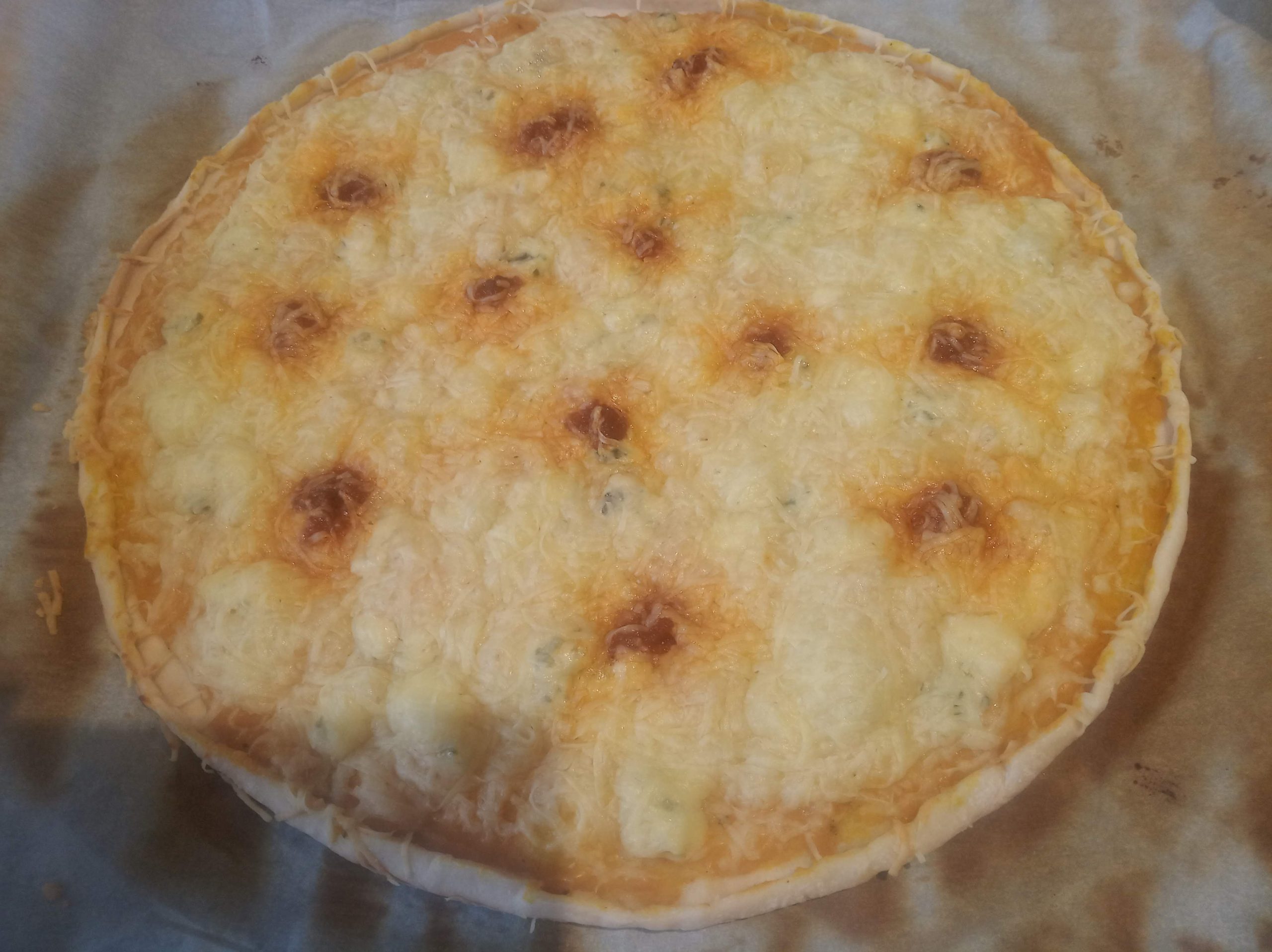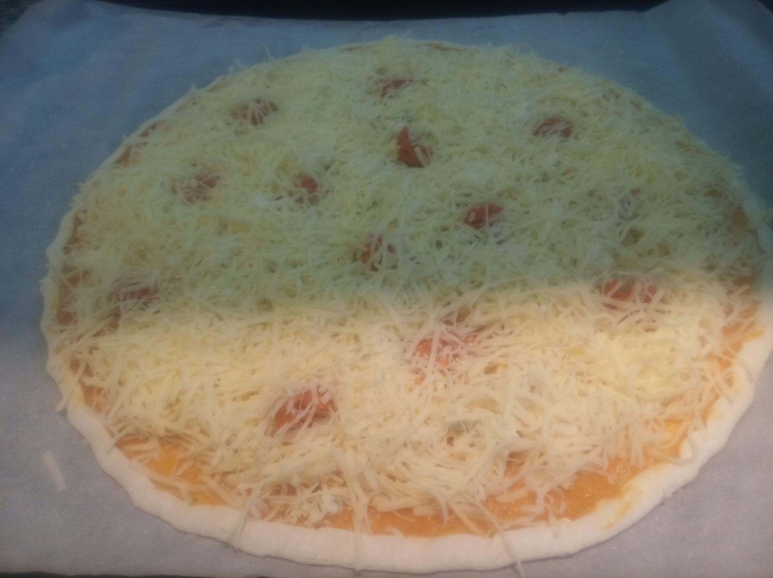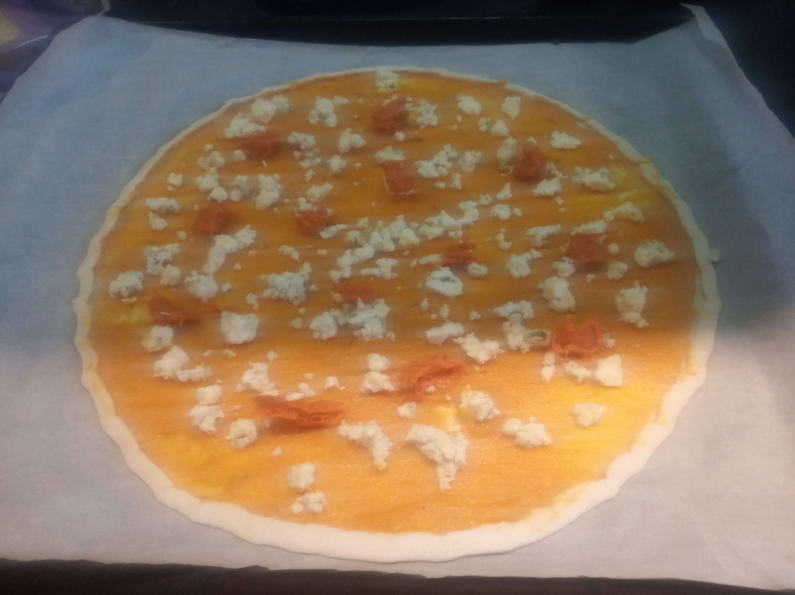 Estirar la masa de pizza, subir un poco los bordes y cubrir con una capa de calabaza, después con el queso azul y sobrasada al gusto y añadir al final el queso rallado por encima con un poco de orégano y pimienta.