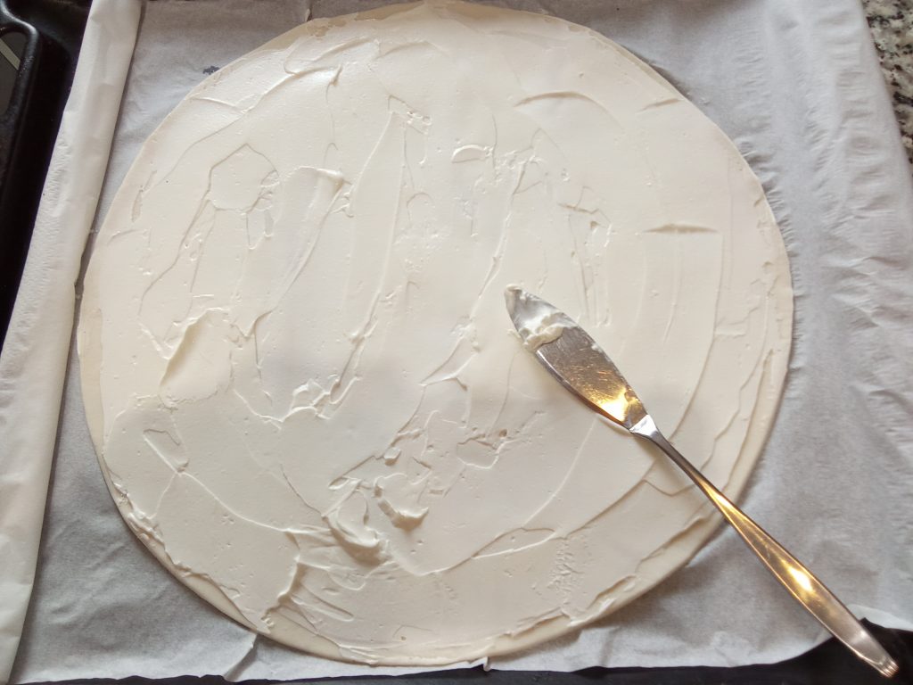 Extender la masa de Pizza en la bandeja de horno en su propio papel. Extender sin llegar al filo el queso blanco de untar, la capa que desees de gruesa.