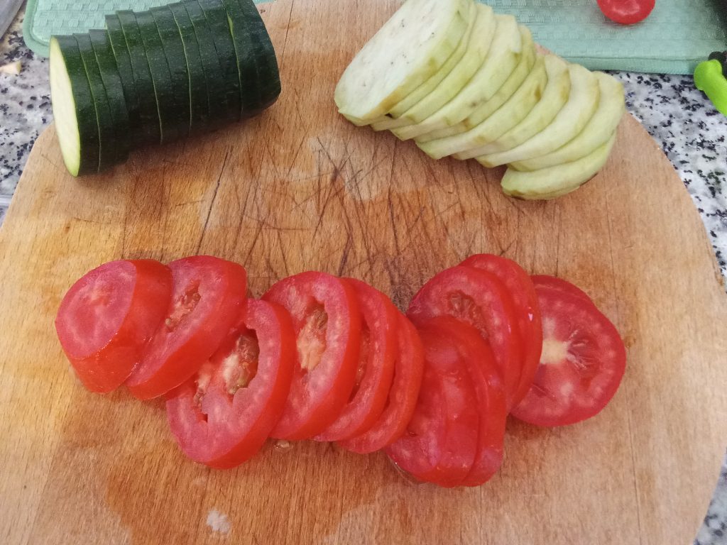 Lava y secar el tomate y el calabacín. Yo a la berenjena le quito la piel. No cortes todas las verduras, corta unas 12 rodajas, según colocas en la masa, mira si necesitas más.