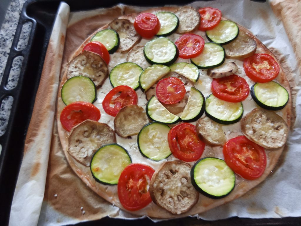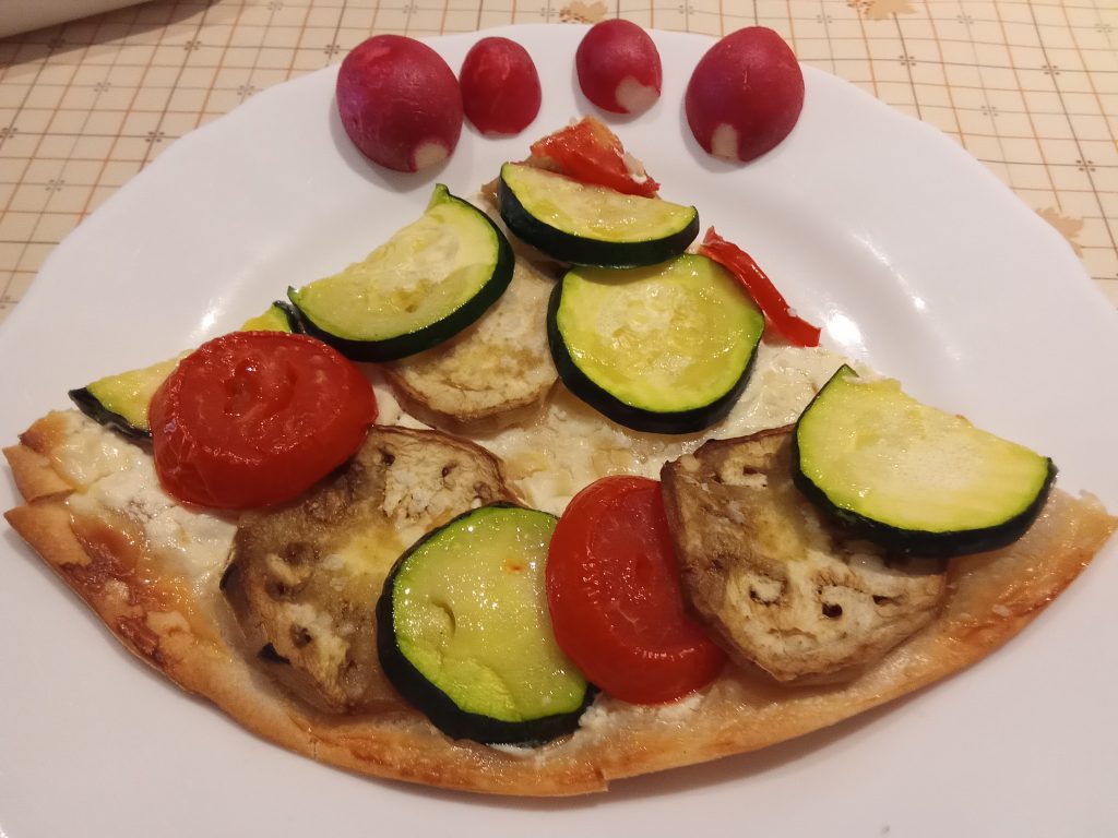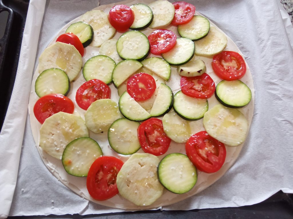 Cortar las verduras unas 12 rodajas de cada una, repartir encima del queso, empezando por el borde, una de cada una, repitiendo así, hasta llegar al centro.