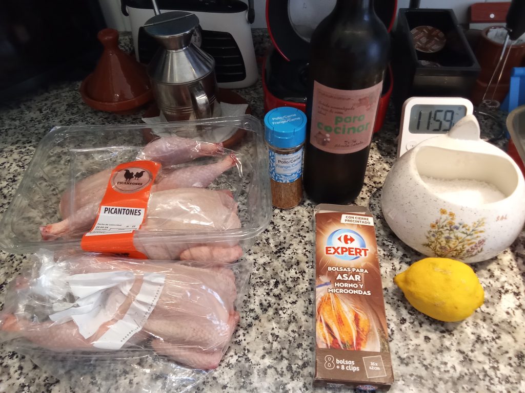 - 1 pollo troceado de Mercadona o 3 Picantones