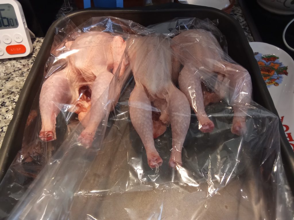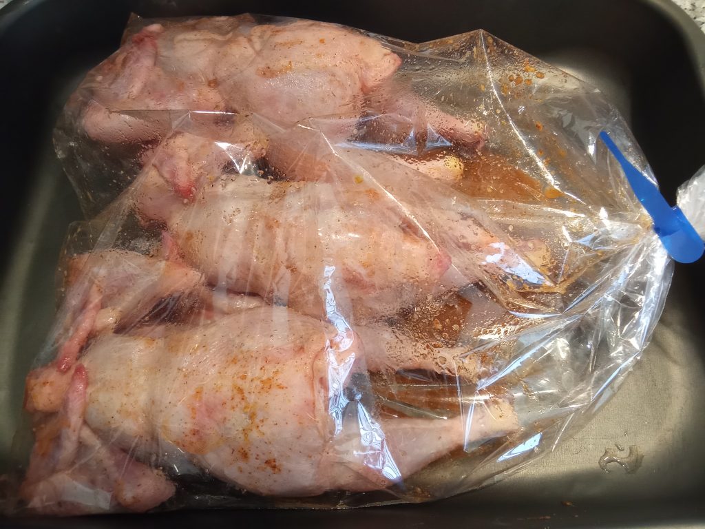 Ponemos la bolsa en la bandeja y distribuimos el pollo troceado.