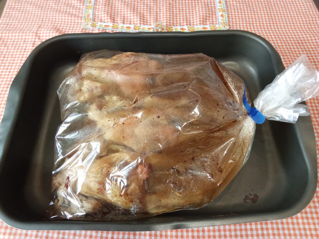 A la hora de servir, sacar la bandeja del horno, corta la bolsa y sacar el pollo a la bandeja, servir con parte de la salsa que tiene y pan para quien quiera mojar.