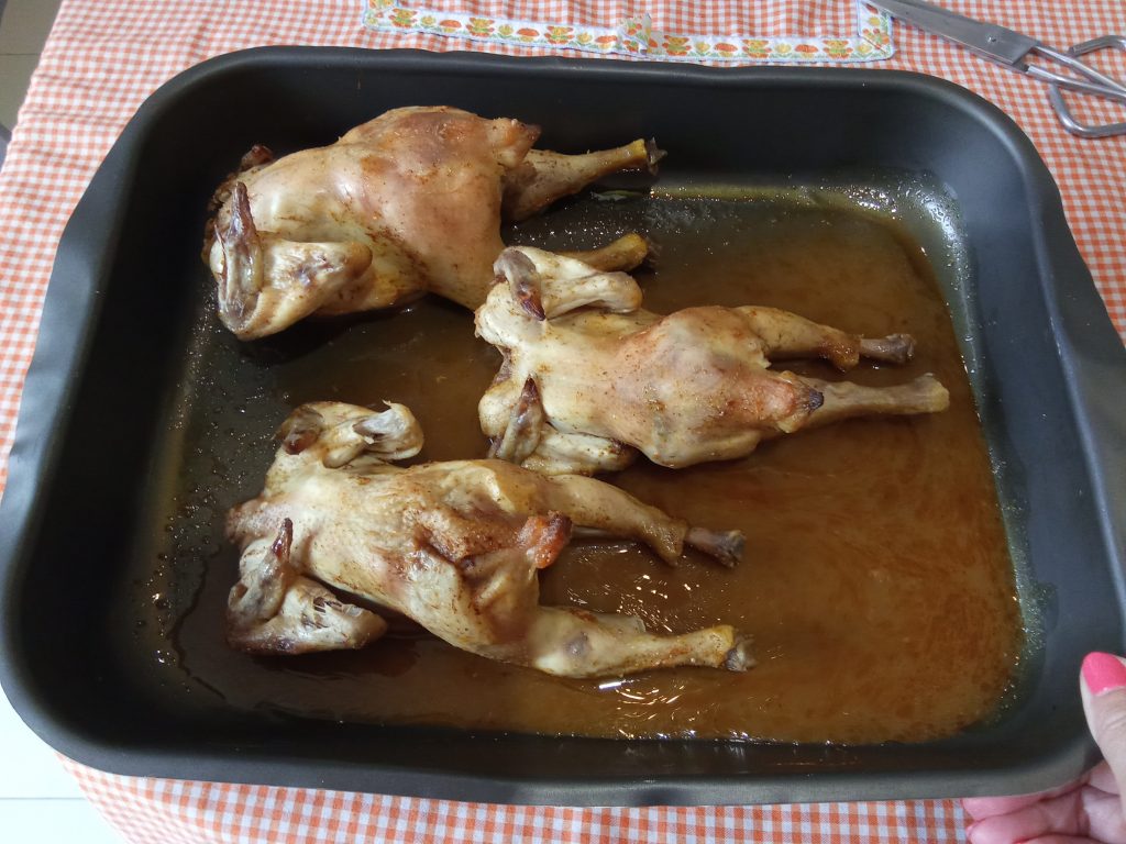 Mezclar todo muy bien y echar encima del pollo y remover muy bien para que se impregne bien. Si son Picantones, echar un poco por dentro.