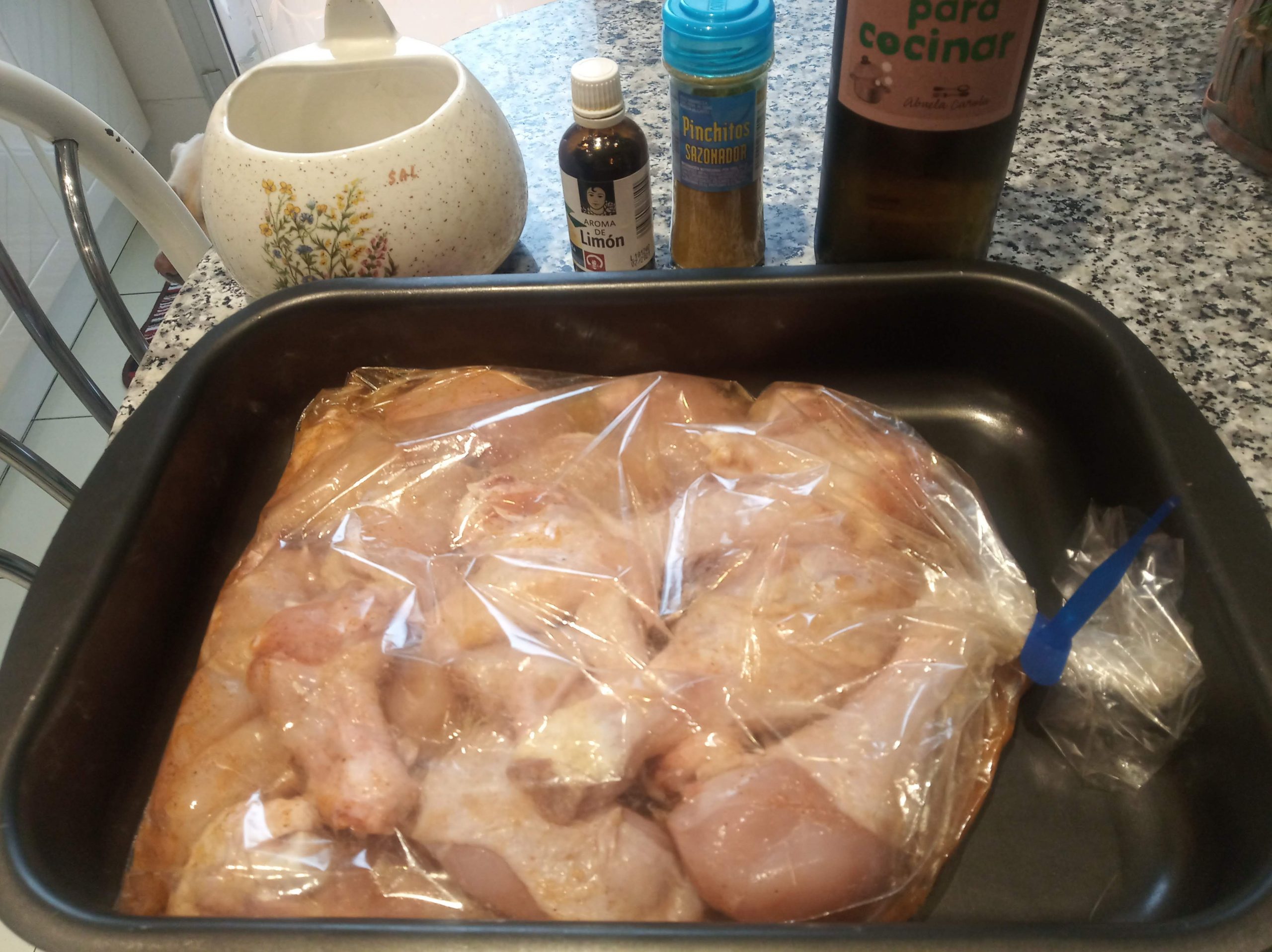 Mezclar todo muy bien y echar encima del pollo y remover muy bien para que se impregne bien. Si son Picantones, echar un poco por dentro.