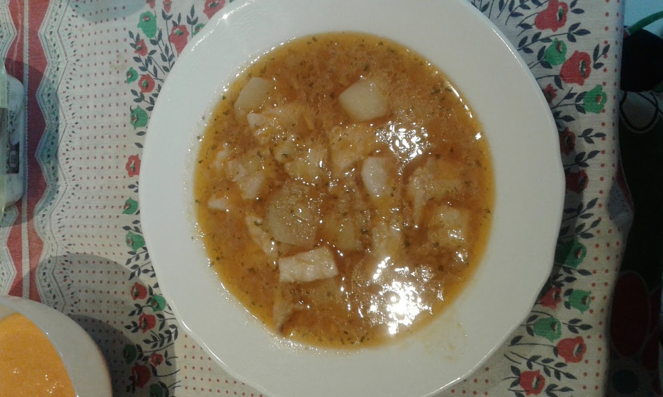 Añadir las patatas cacheadas, una hoja de laurel, un poco de pimentón y el caldo de pescado.