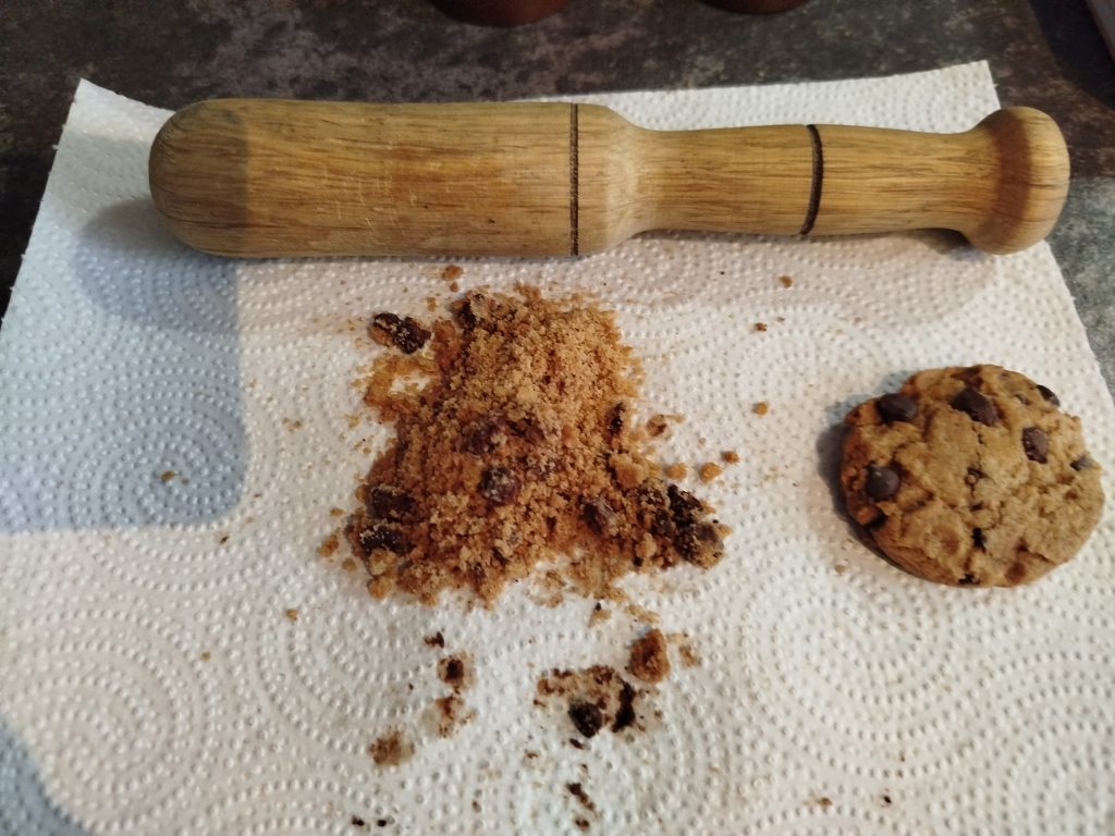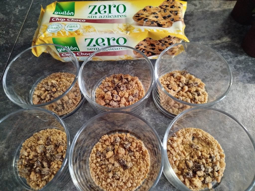 Preparamos los 6 moldes, troceamos cada galleta, en un papel de cocina cerrado, e ir repartiendo en cada molde.