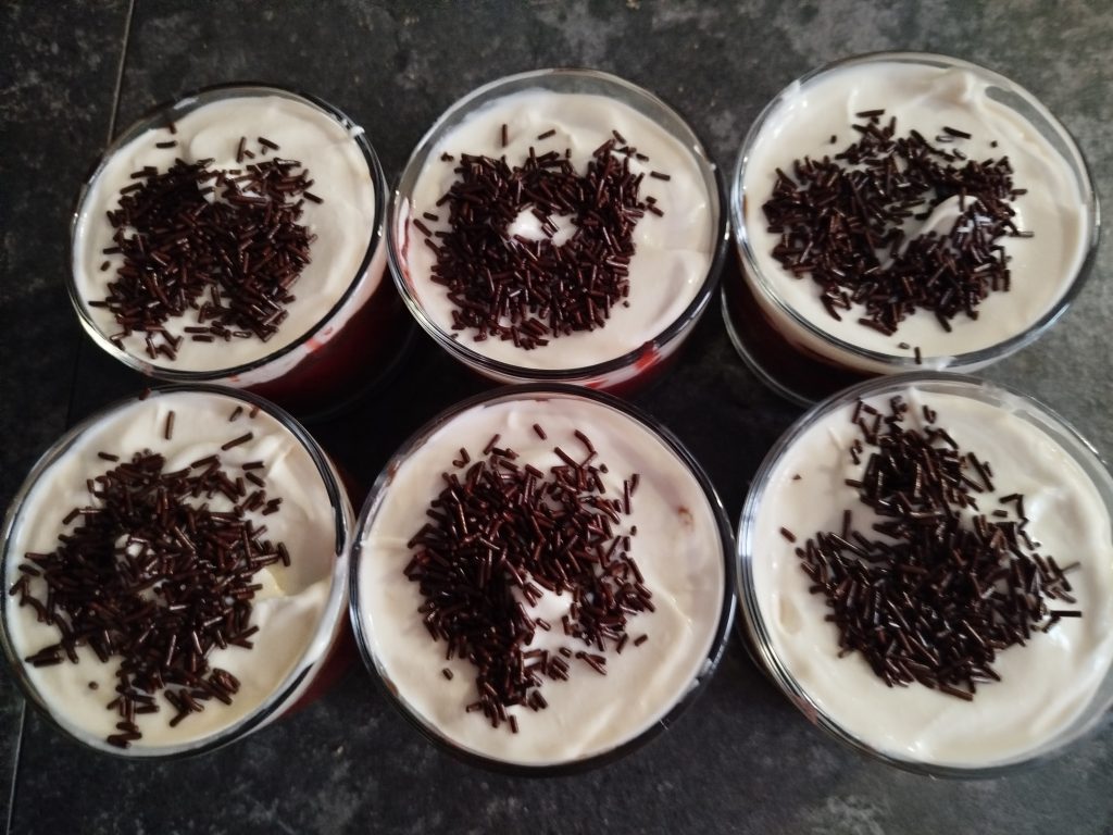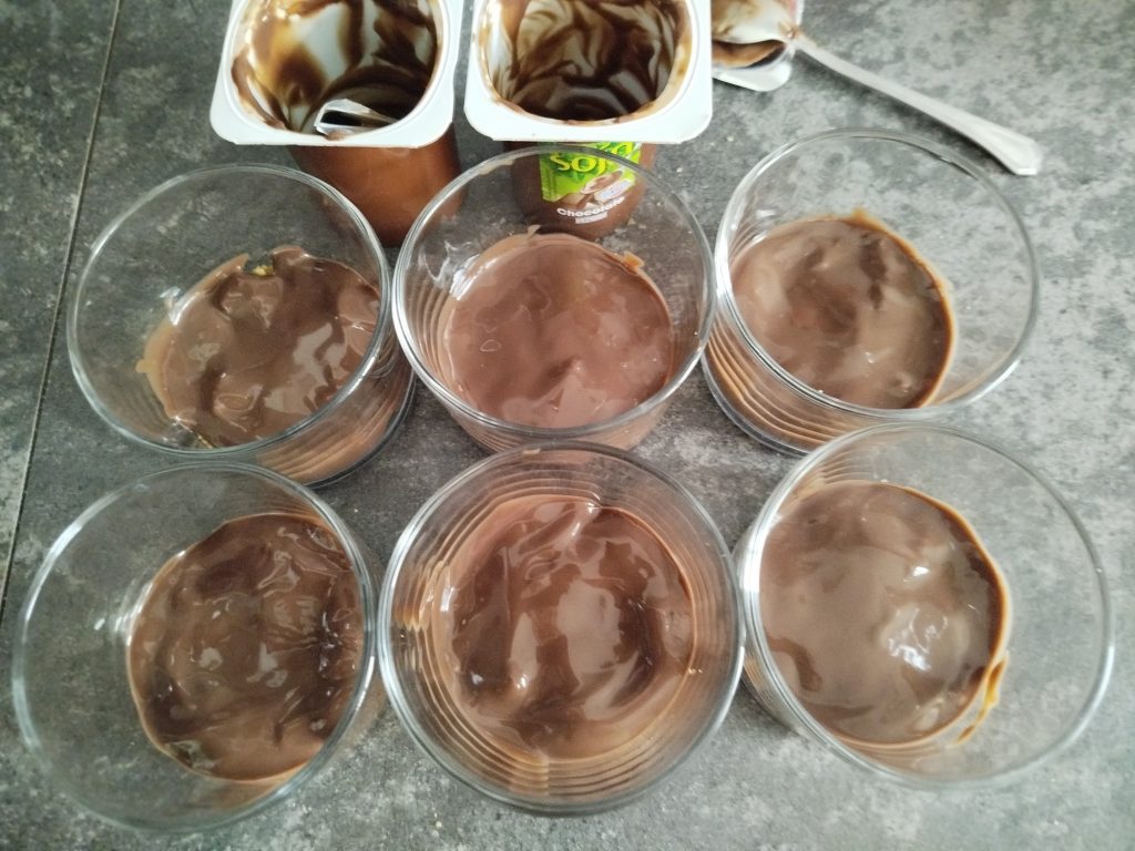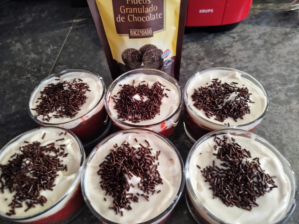 Puedes repartir con una cuchara o pasar a una manga pastelera, sobre la crema de chocolate, y repartir por encima fideos de chocolate, meter otra vez en el frigorífico, para que cuaje todo bien.