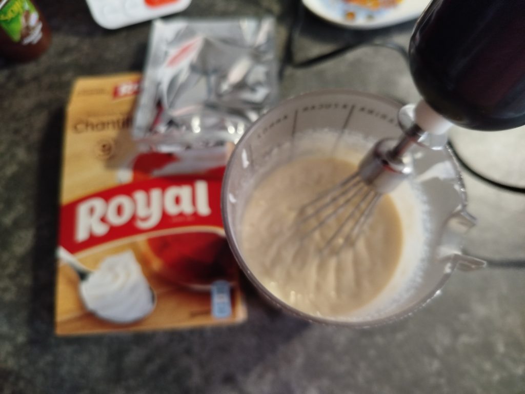 Preparar el Chantilly con la bebida de soja, según indica el paquete.