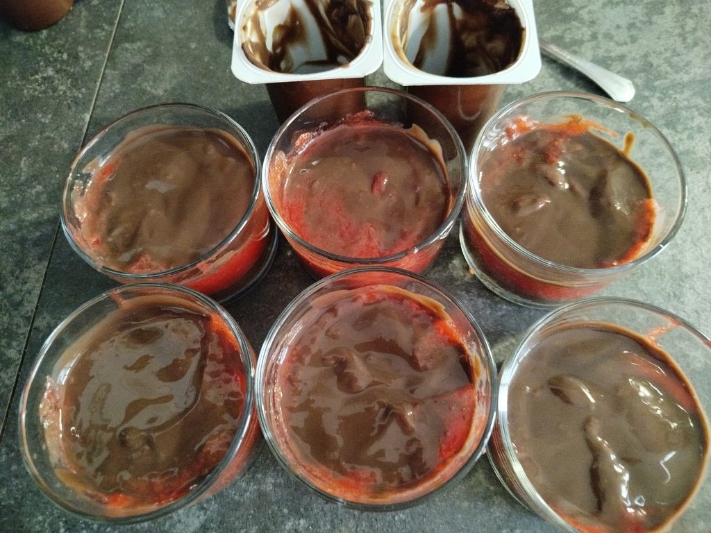 Repartimos unas dos cucharadas, encima de la crema de chocolate, pasar el sobrante de la mermelada a un bote de cristal, y reservar en el frigorífico.