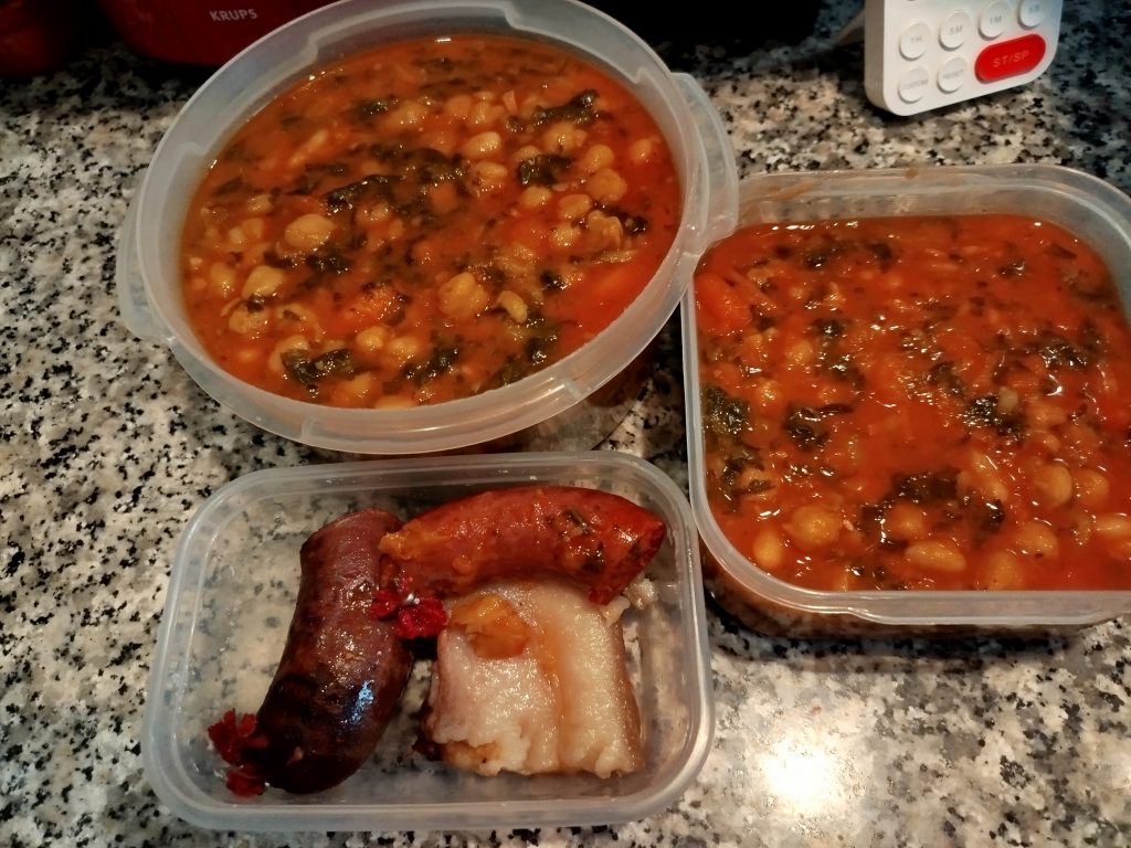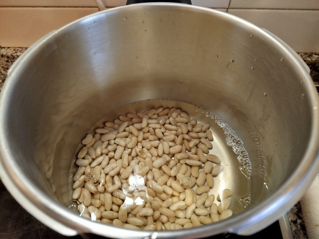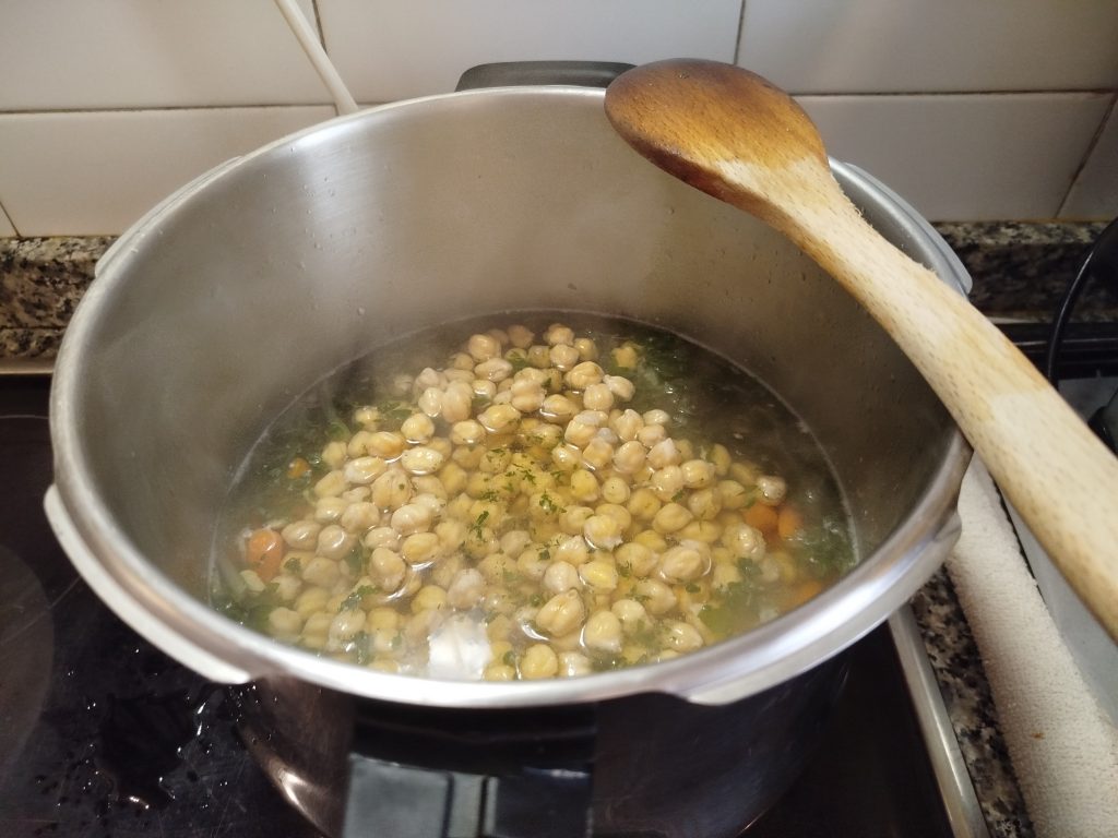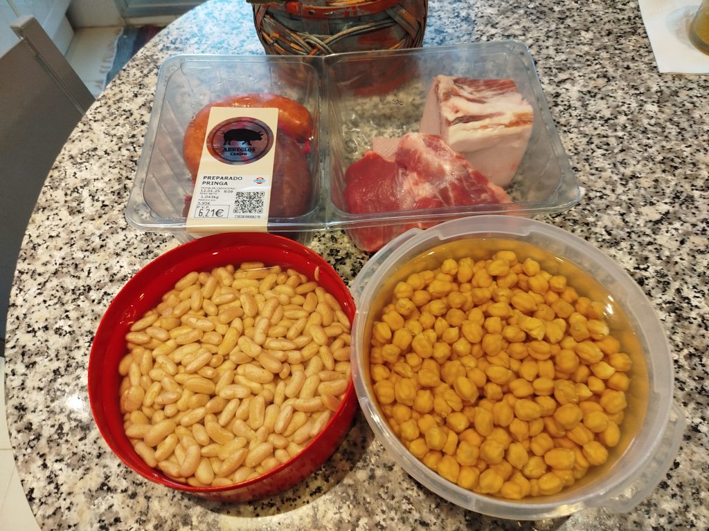 Acuérdate el día anterior, poner las alubias en remojo con un poco de sal y bastante agua, y los garbanzos con un poco de sal, bicarbonato y bastante agua, para que cuando engorden, tengan agua, y no te quedes corta.