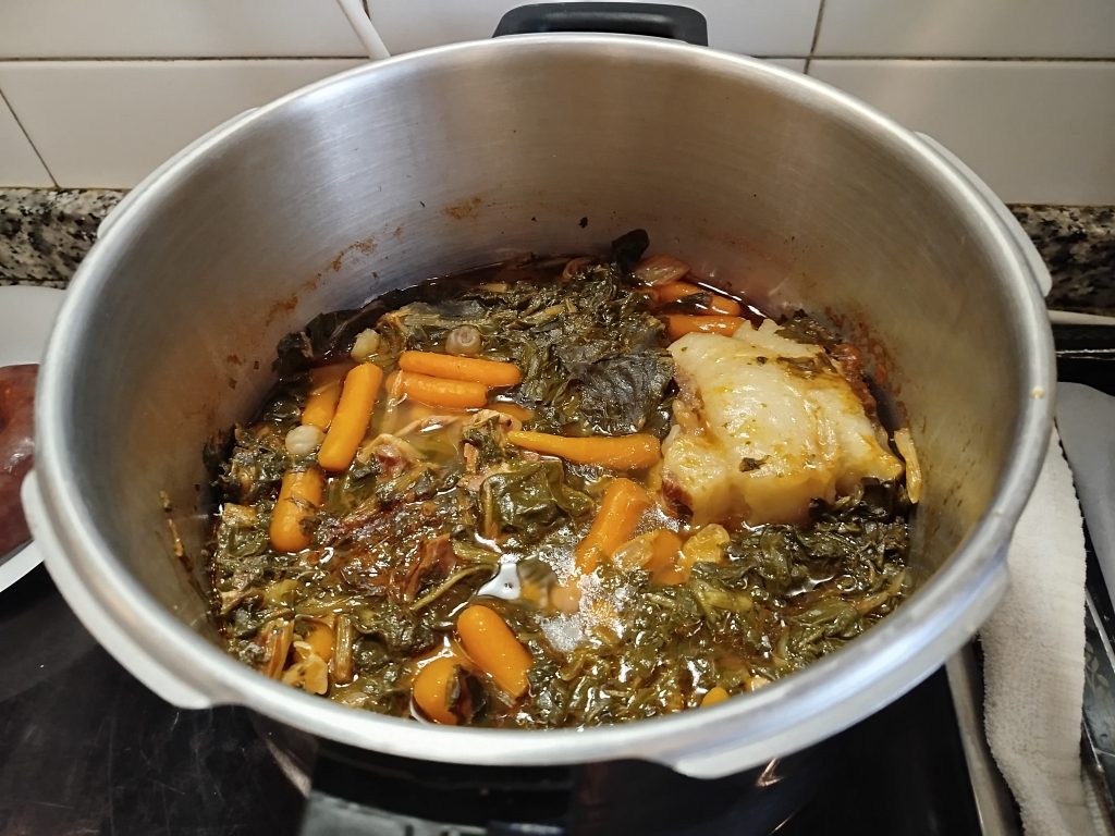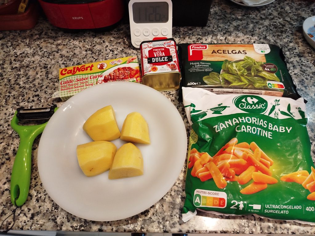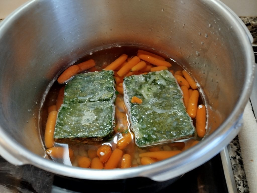 Volvemos a echarlo en la olla, con el agua fría, le añadimos las acelgas y zanahorias congeladas, hasta que empiece a humear.
