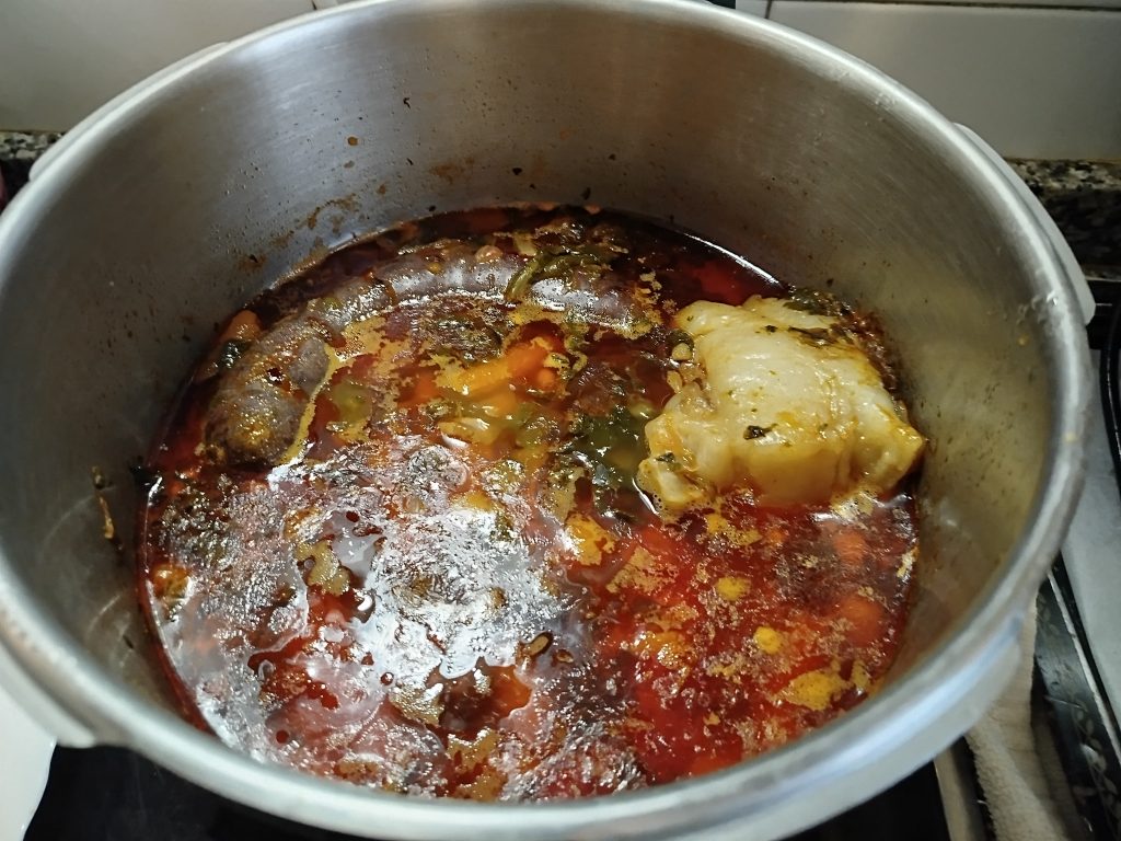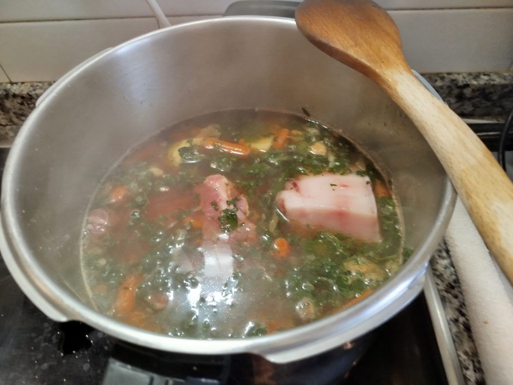 Cuando puedas abrirla, le añades el chorizo y la morcilla, pinchada para que el pellejo no reviente, empujar para abajo, para que quede cubierta, y poner otra vez a cocer, esta vez NO tapar por completo, y cuando empiece a hervir, dejar cocer unos 15 minutos.