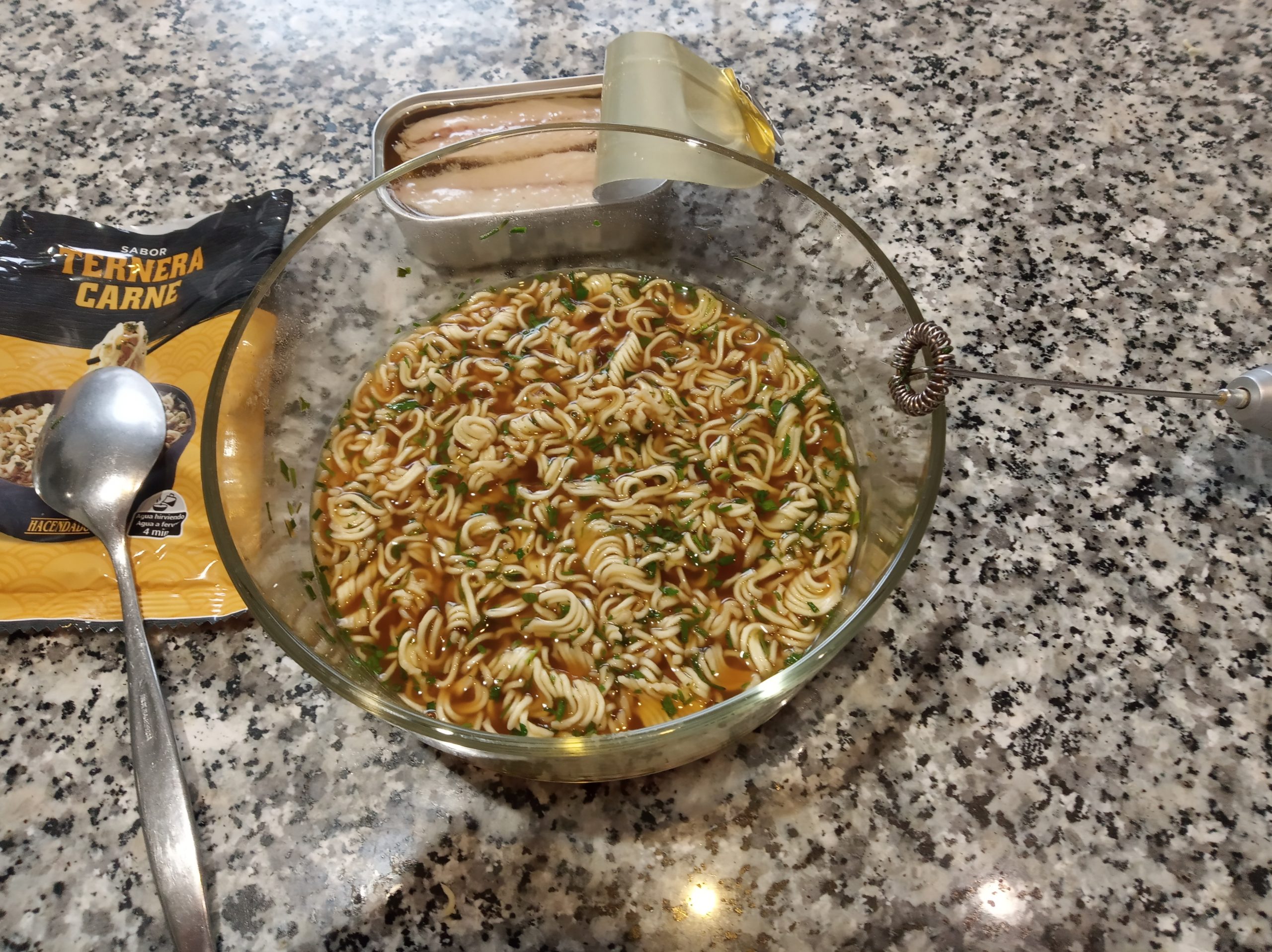 He probado este sobre de fideos con sabor a ternera, y está bueno, fácil y rápido de preparar, y puedes acompañar con lo que tú quieras, yo esta vez, con una lata de caballa en aceite de oliva, y lo he repartido para tres personas, como acompañamiento a unas empanadillas de sardinas.