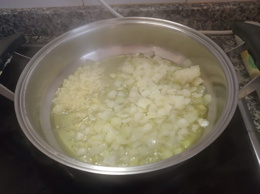 Poner en una cacerola grande baja, un poco de aceite, el ajo y la cebolla, todo picado, con un poco de sal para que sude.