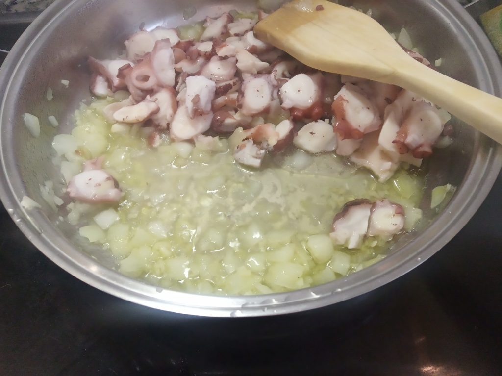 Cuando la cebolla este transparente, añadir el pulpo troceado, y el pimentón dulce, mezclar todo muy bien, y dejar cocer unos minutos.