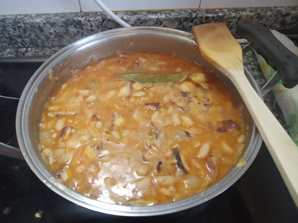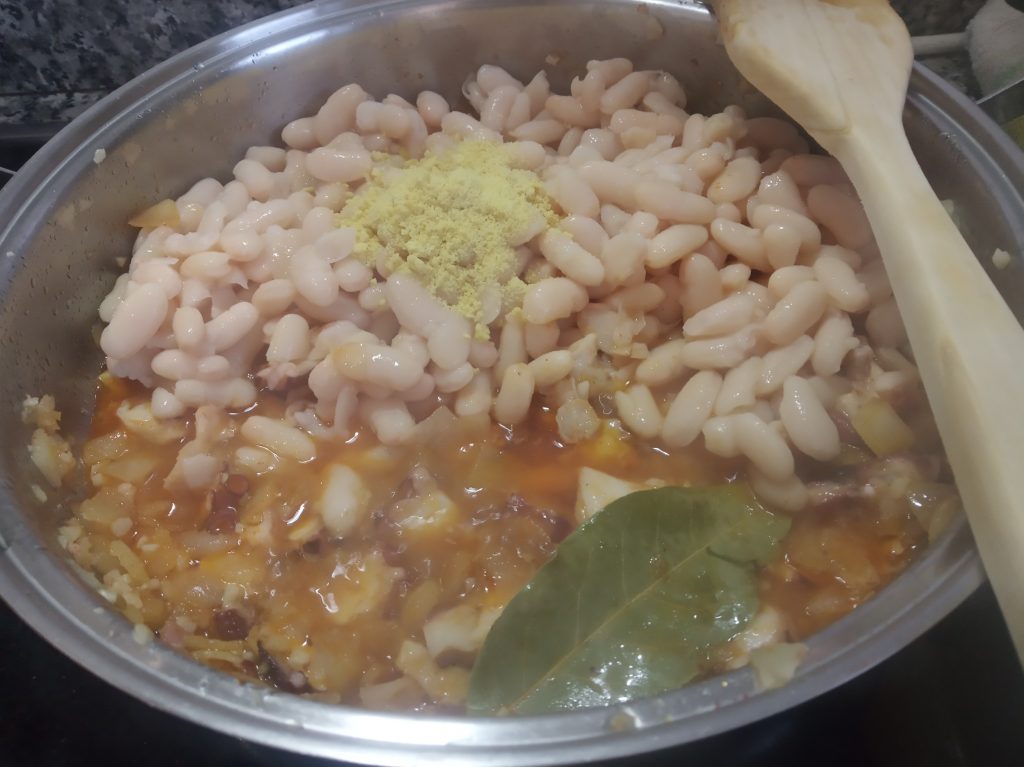 Incorporar las alubias, la pastilla de caldo de pollo y un vaso de agua, o si tienes caldo de pollo, y la hoja de laurel.