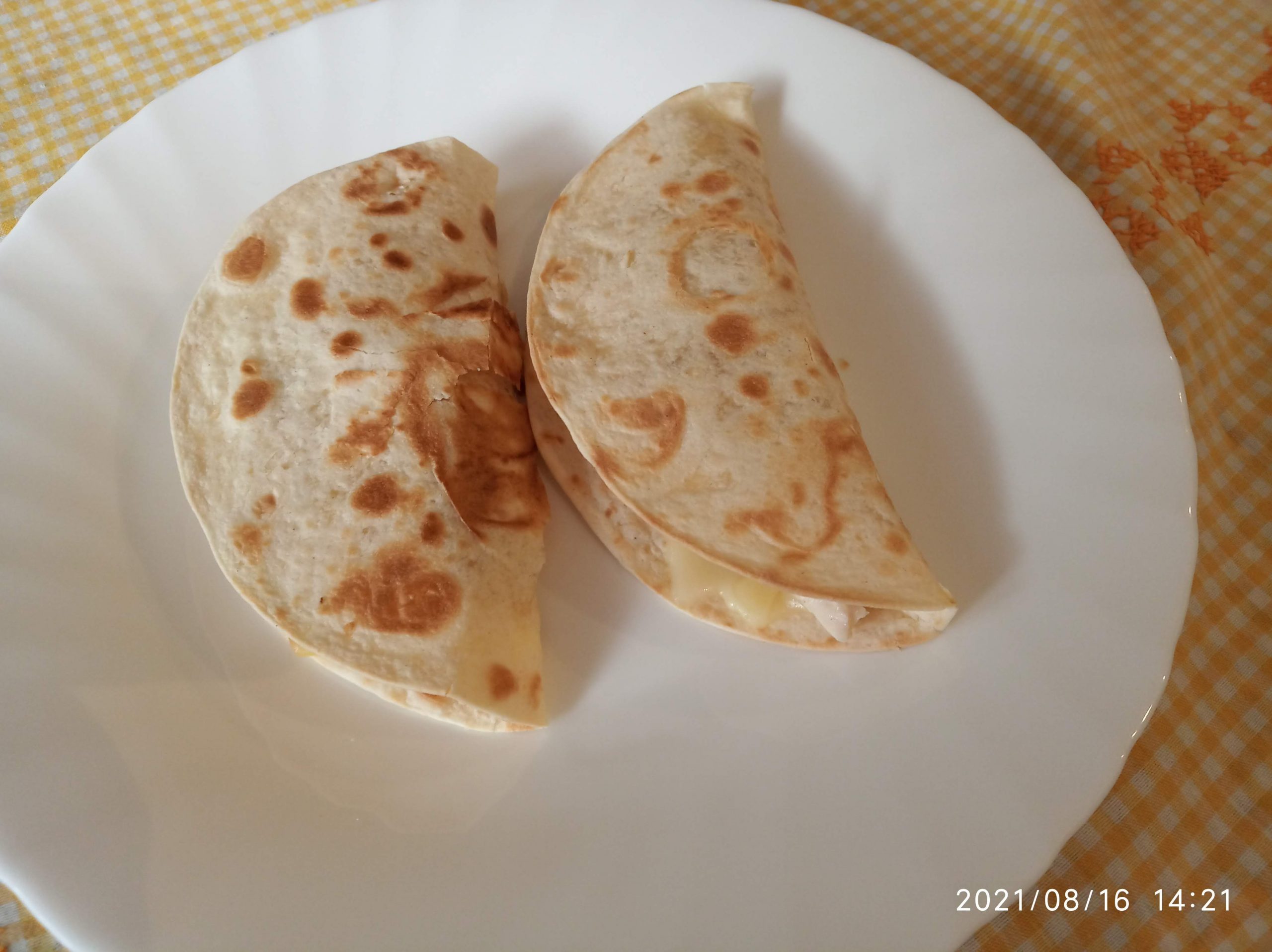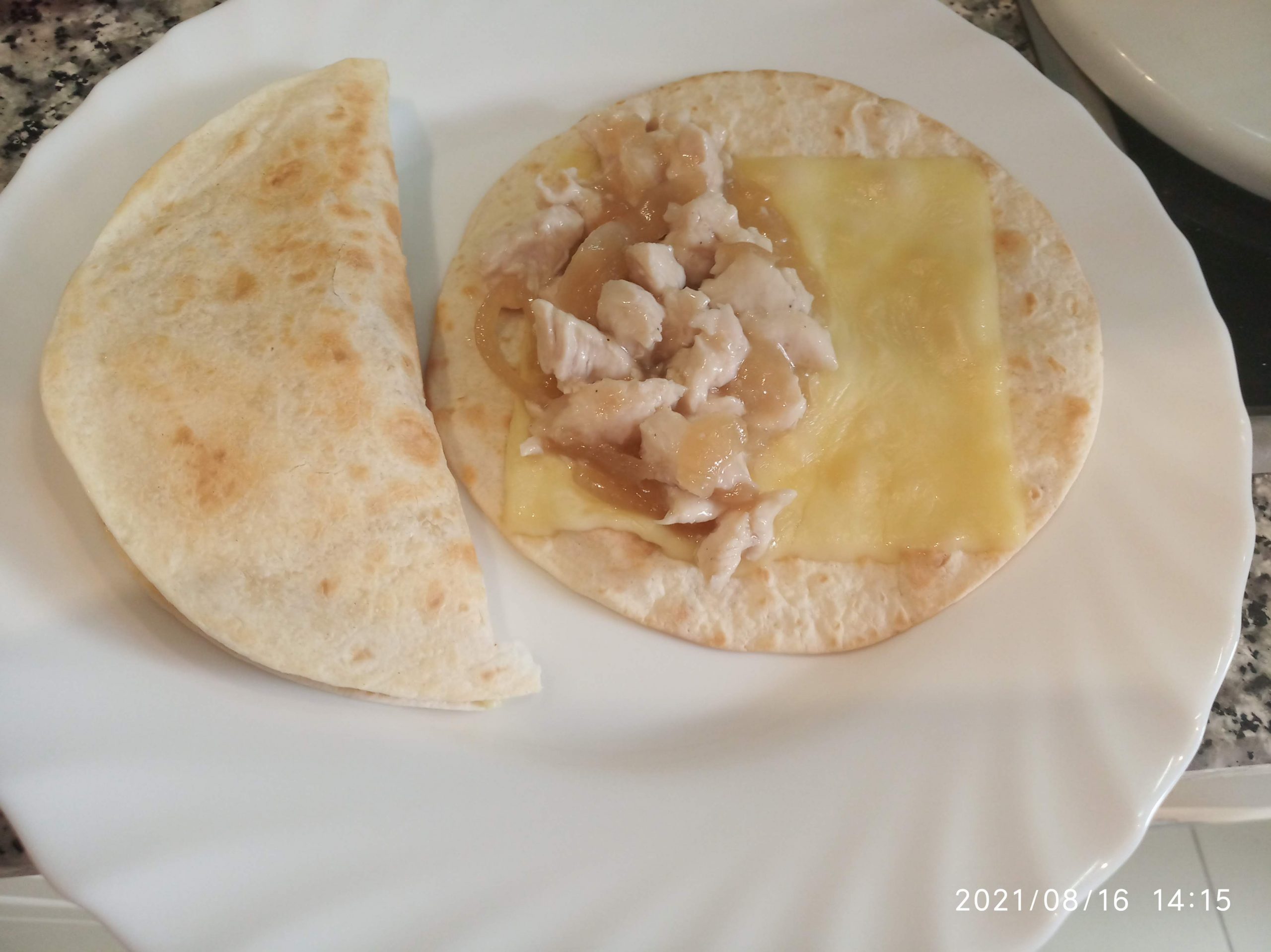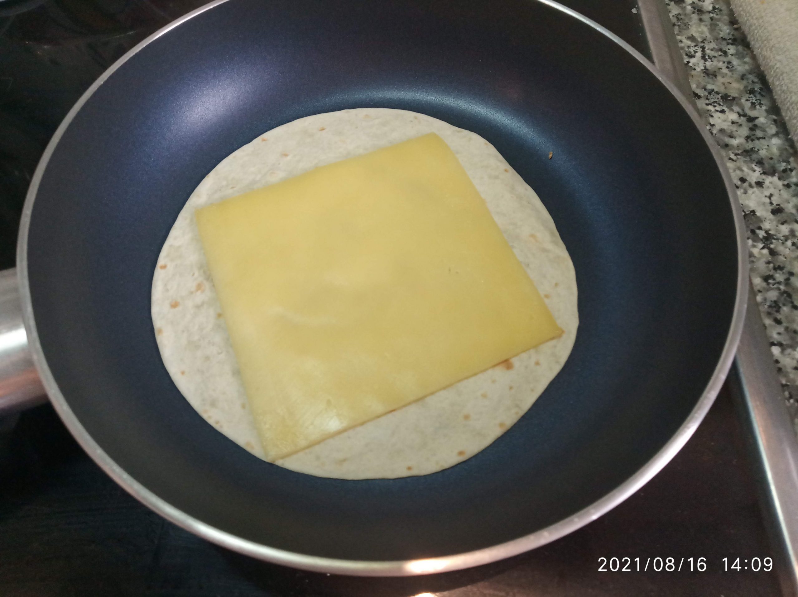 A la hora de comer, pon una sarten que quepa la Quesadilla, ten cuidado de ponerlo en el mínimo, no se te queme, la calientas, por un lado, le das la vuelta y le pones una loncha de queso, cuando veas que se está ablandando, la colocas en el plato le pones en el centro el relleno y antes de que se enfrié la doblas por la mitad.
