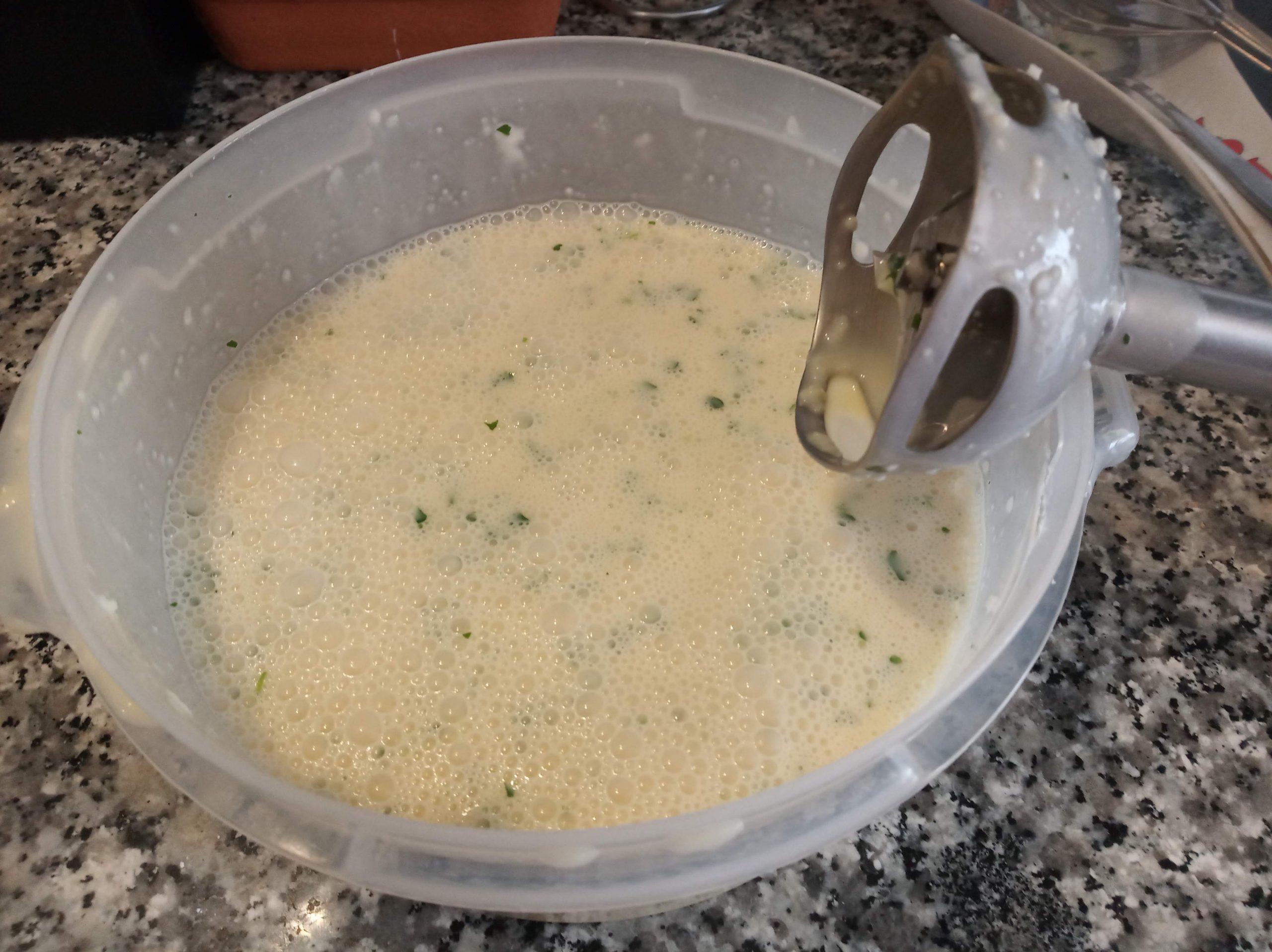 Mezclar la harina con la leche, la nata, el queso rallado, sal, ajo picado y los huevos batidos.