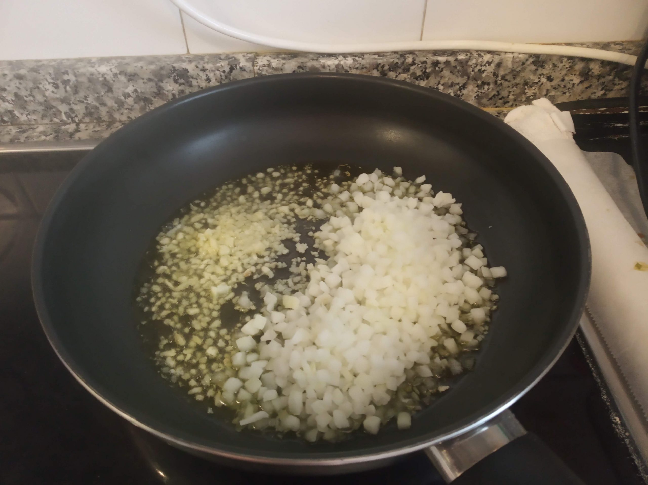 En una sartén con aceite refreír un poco la cebolla y el ajo picado.