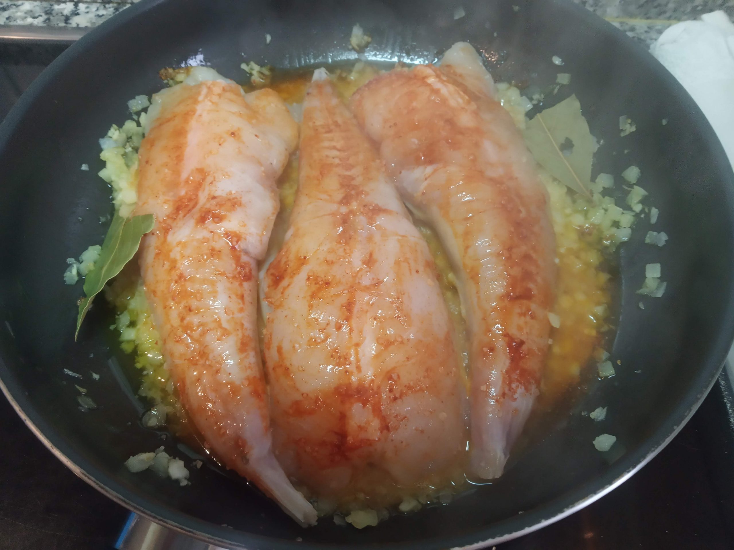 Incorporar las colas de rape con un poco de sal, pimentón dulce por las dos caras y una hoja de laurel.