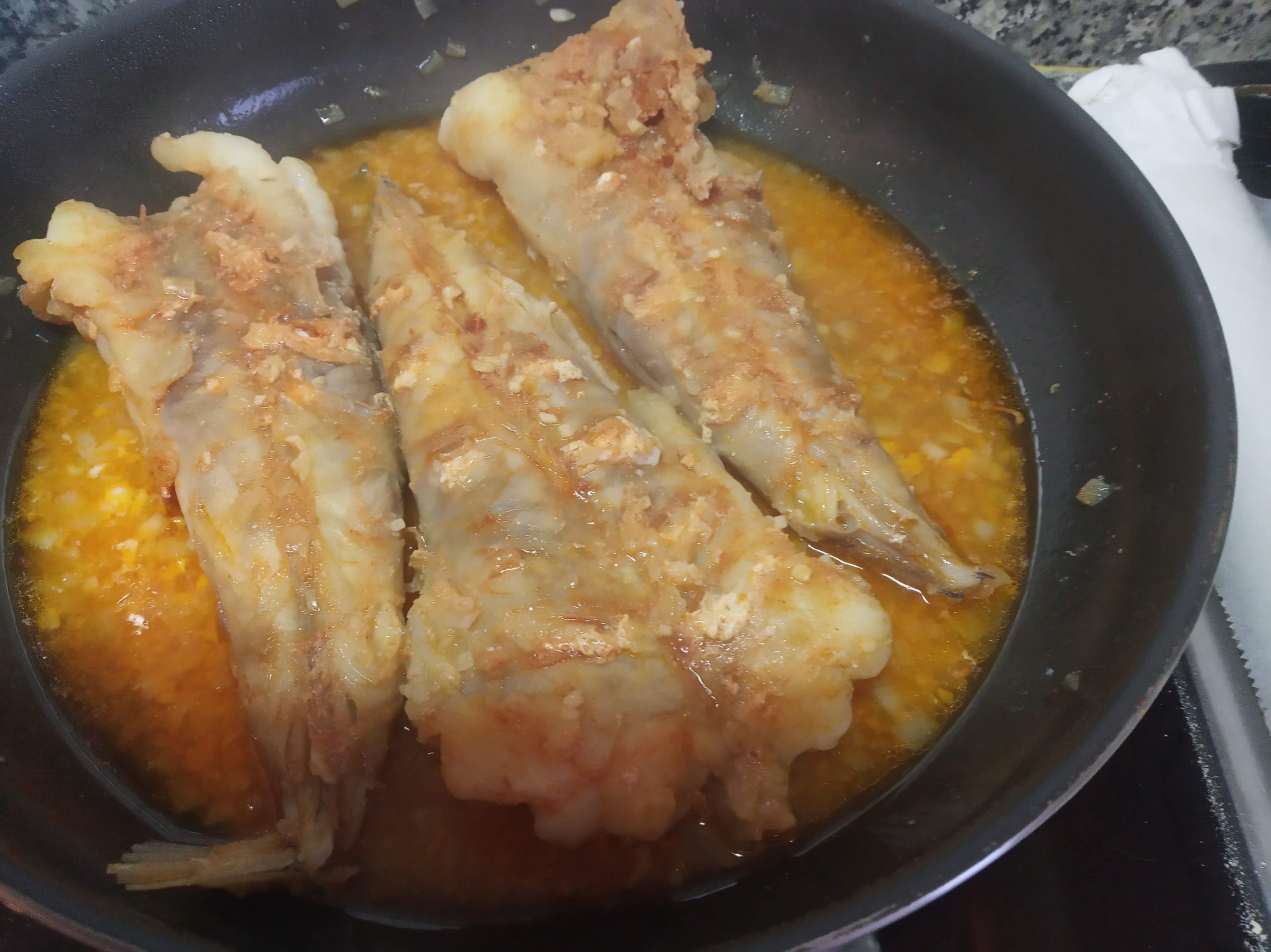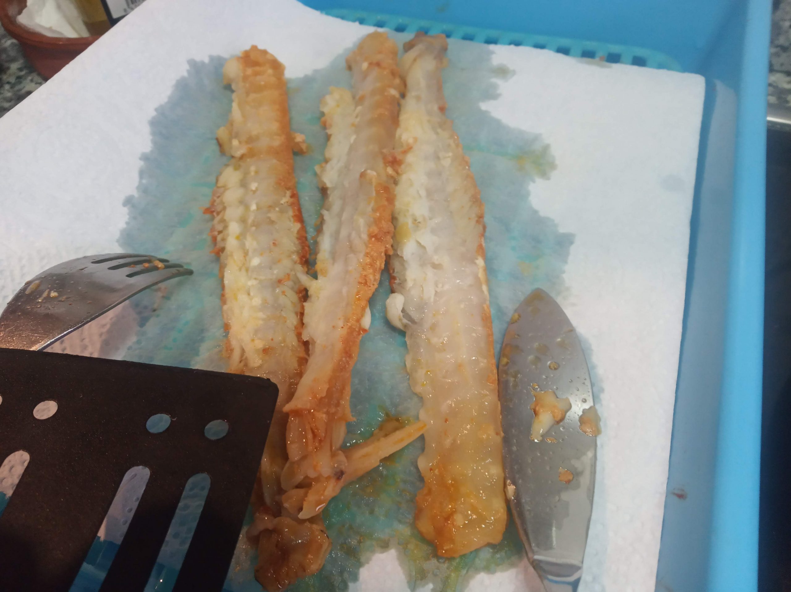Dejar enfriar el rape, en la misma sartén o en una rejilla. Luego se le quita a las colas la parte del centro.