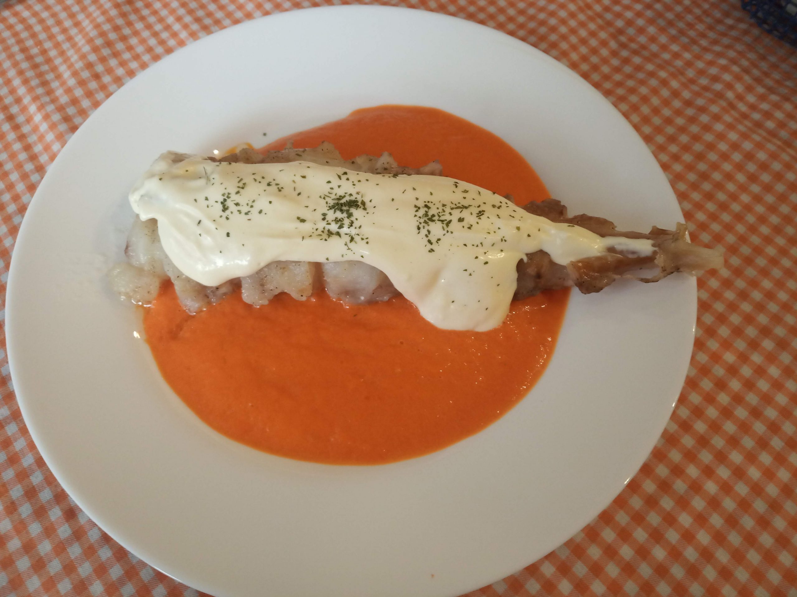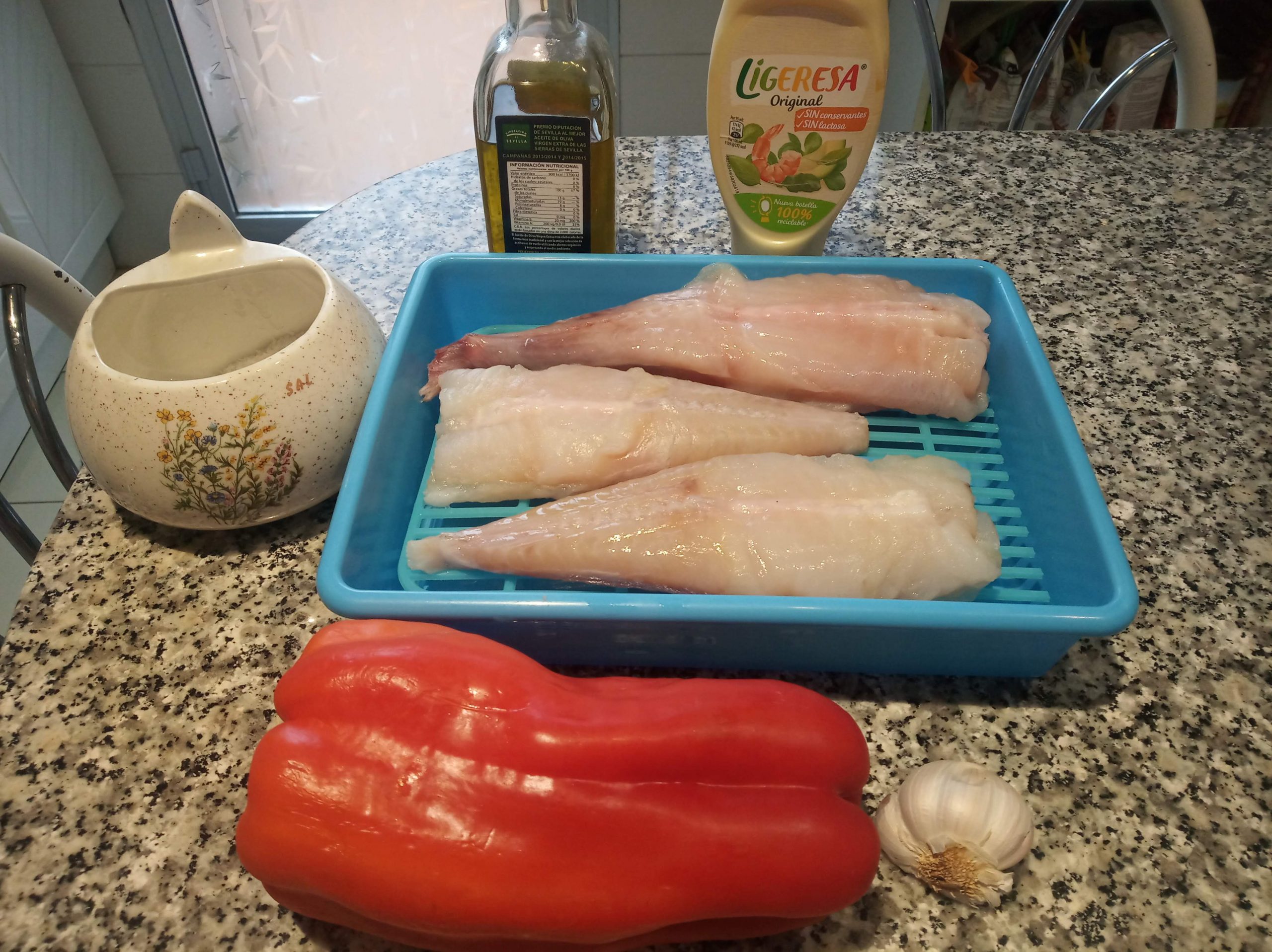 Cubrir las rodajas de rape con la mayonesa y gratinar justo antes de servir sobre una base de coulis de pimientos. O servir, sobre la base de coulis, el rape y la salsa de mayonesa y ajo por encima, y terminar decorando con un poco de perejil picado, sin gratinar.