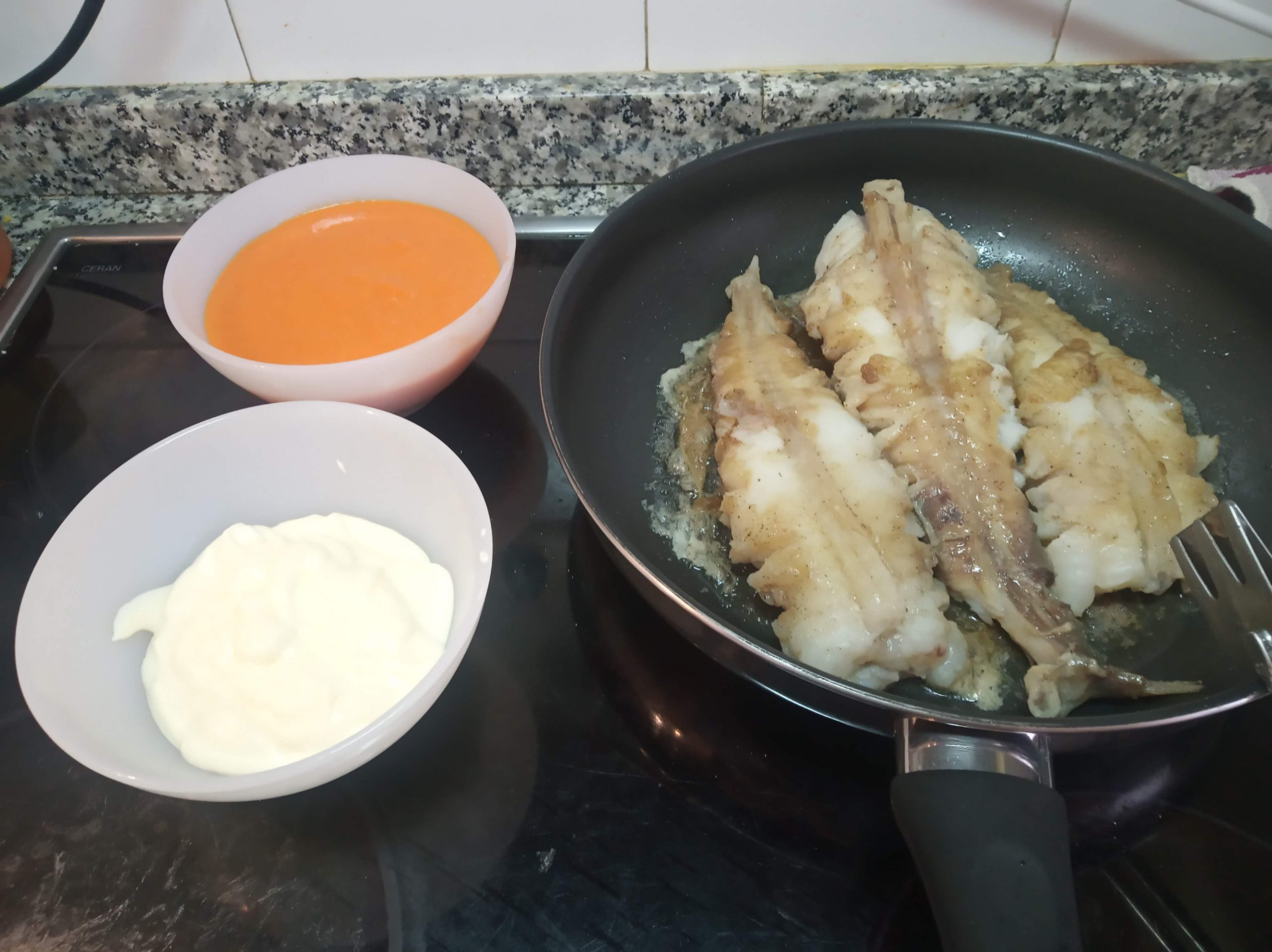 Salpimentar el rape, previamente descongeladas y cocer en la plancha caliente engrasada con aceite. Mientras, pelar y cortar el diente de ajo en pequeños trozos y colocarlo en el vaso de la batidora con el huevo, la sal y el limón para hacer la mayonesa.