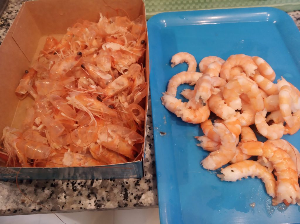 Pelar los langostinos y reservar, las cascaras por un lado y por otro la carne.