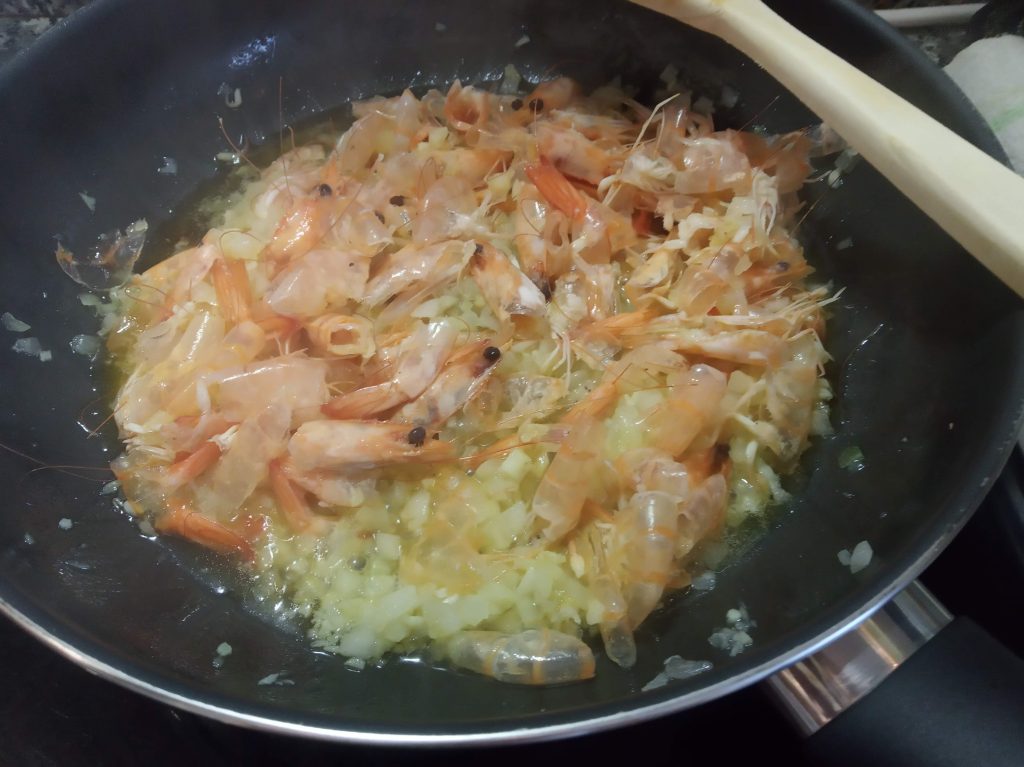 En una sarten, echamos un poco de aceite y el ajo troceado, antes de que coja color, le añadimos la cebolla troceada, dejar sofreír unos 5 minutos y añadir, el tomate rallado y las cascaras y cabezas de los langostinos.