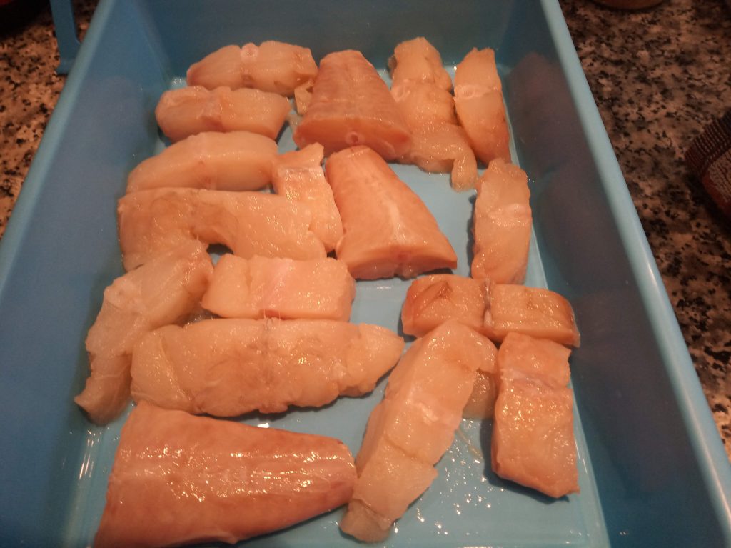 Cortar en rodajas las colas de rape, arrastrando el cuchillo para separar el pellejo de la carne. Reservar.
