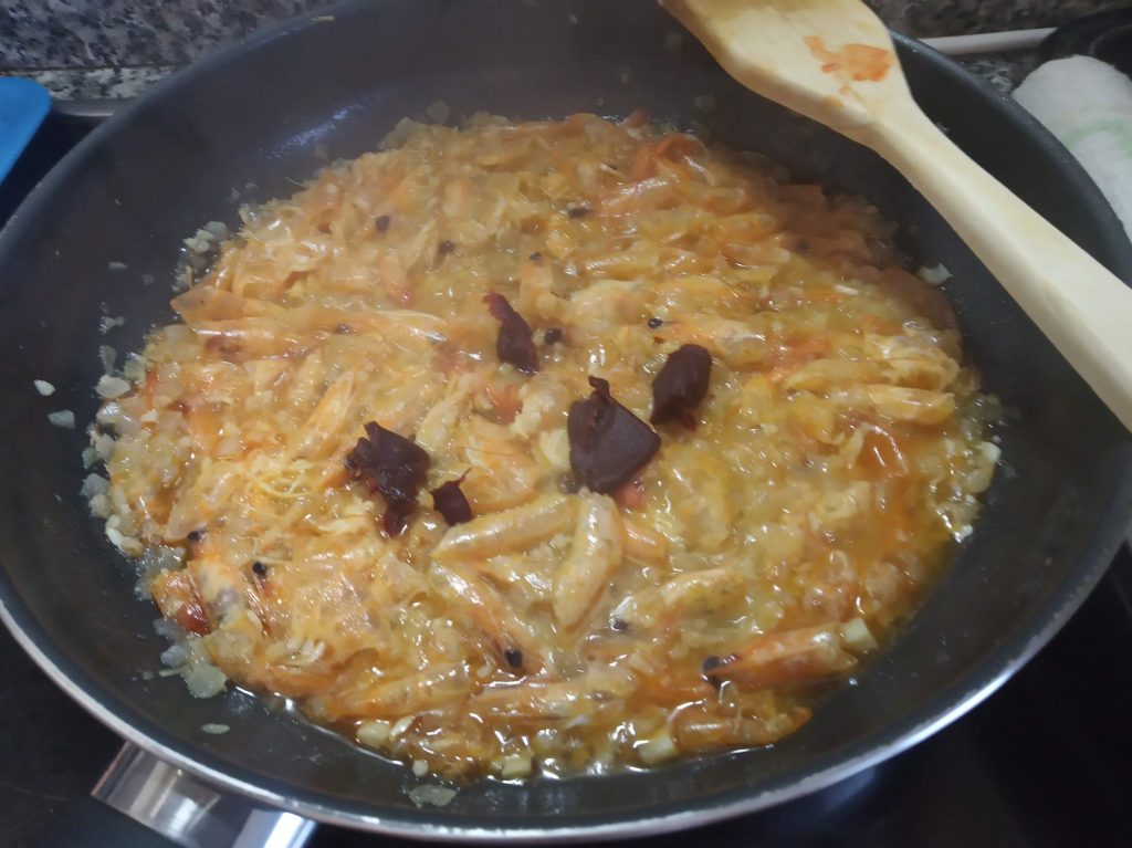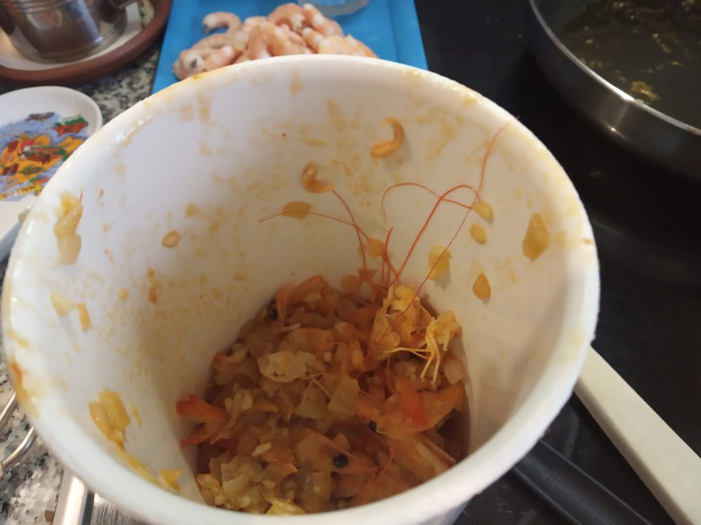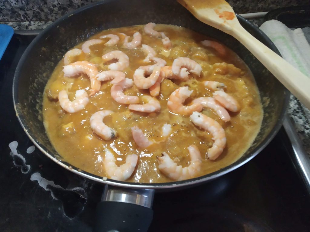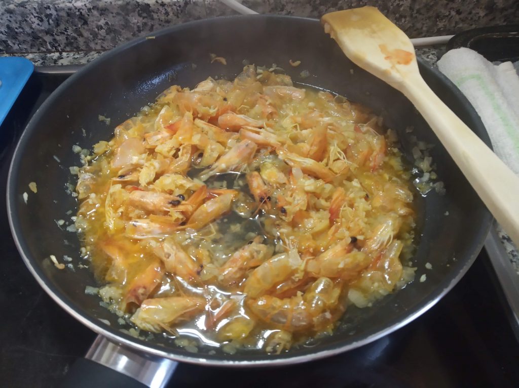 Añadir, por último, los langostinos que, al estar ya cocidos, solo tiene que atemperar.