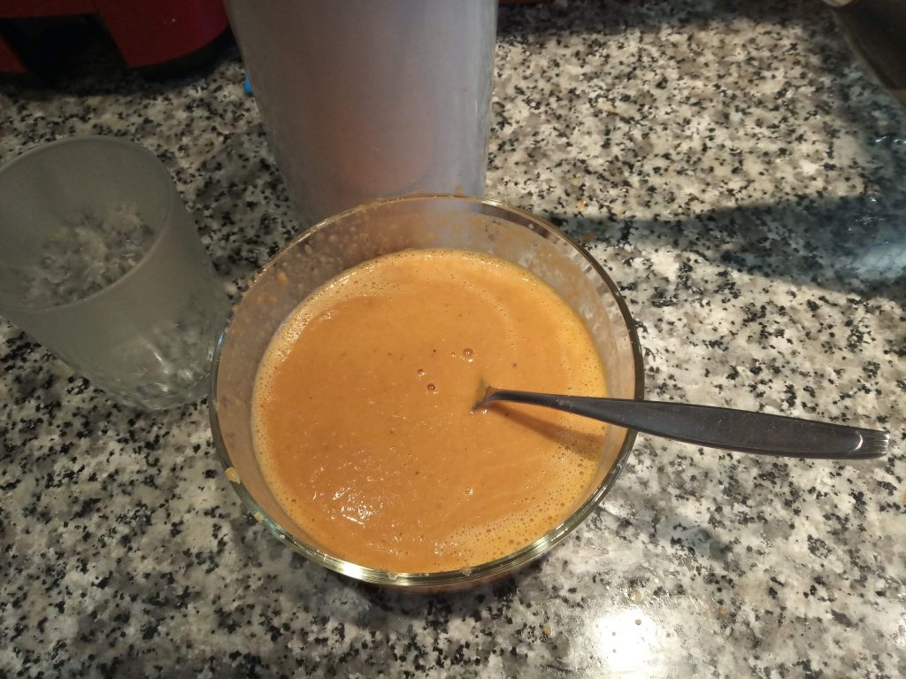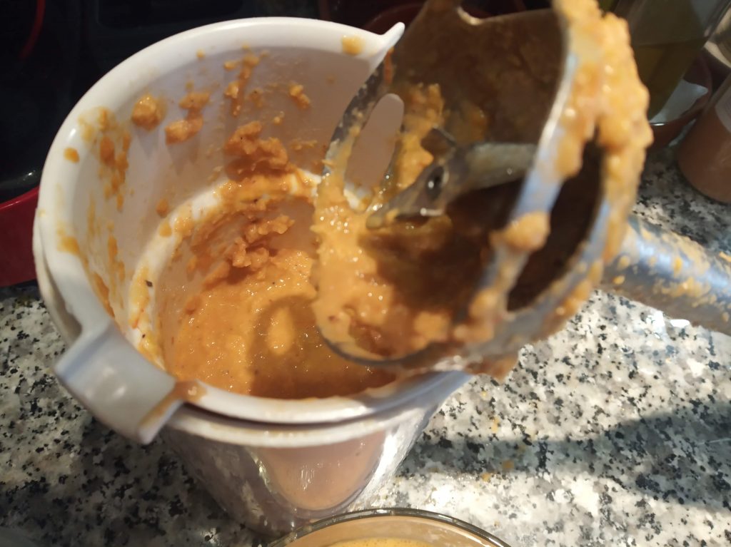 Pasar todo al vaso de la batidora, y triturar, pasar a un cacharro colándolo y añadiéndola un poco de agua.