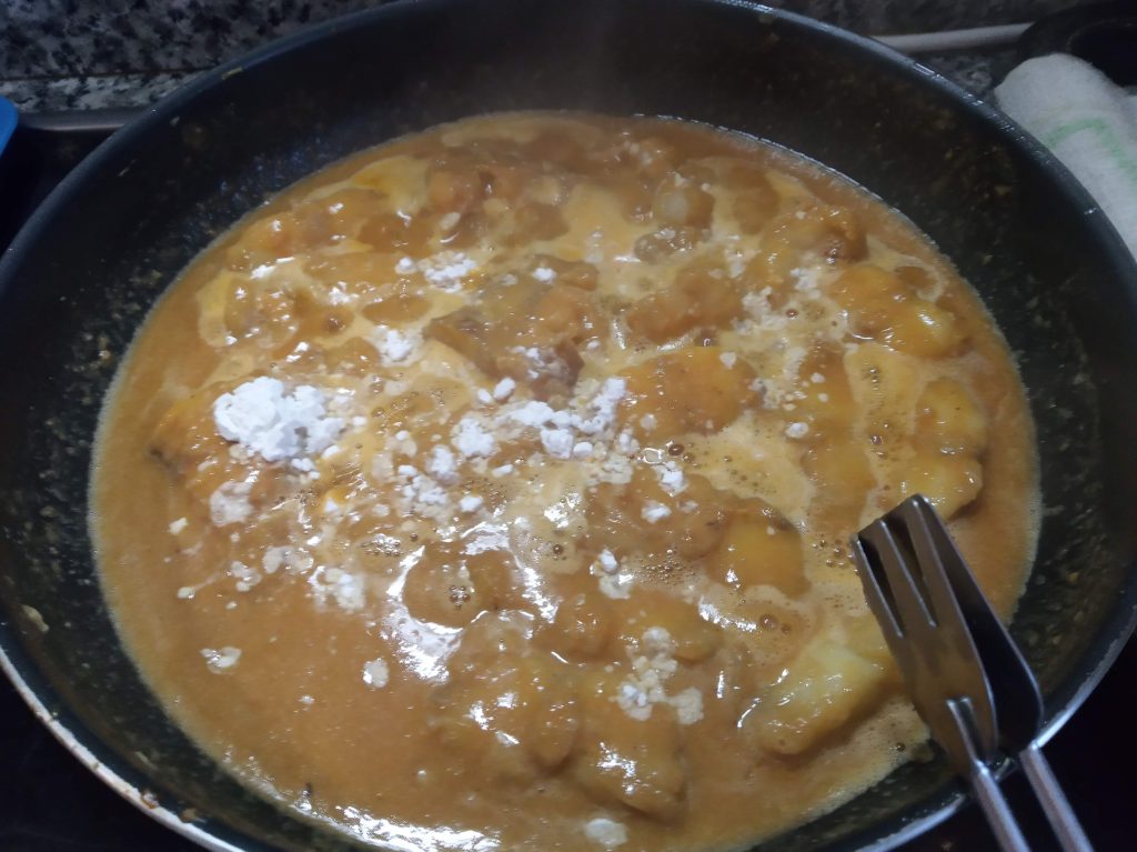 Añadir la salsa, ya colada, si hace falta, añadir una cucharada de Maicena, ligar todo muy bien, dejar cocer otros 5 minutos a fuego bajo, mover para que no se pegue.