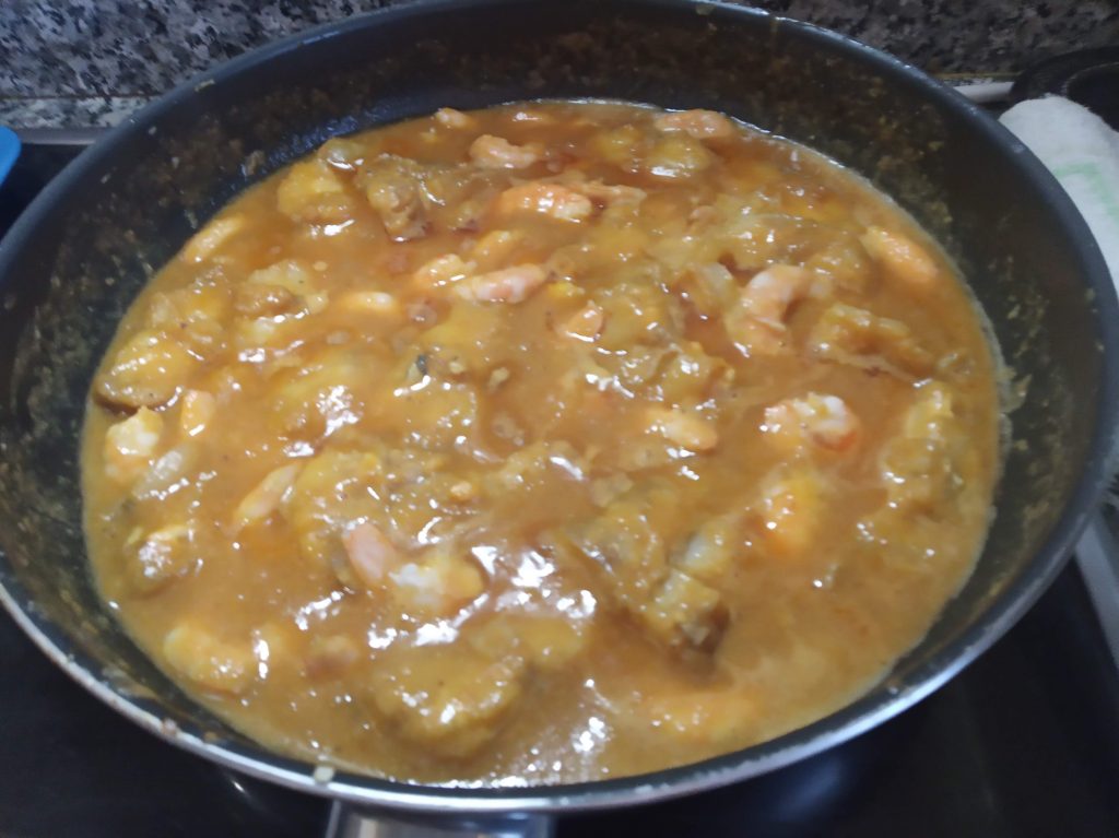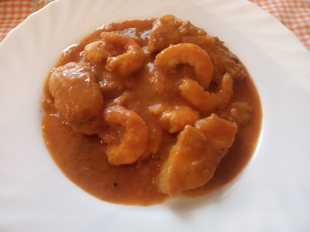 Servir en plato llano, repartiendo, el rape y los langostinos, con la salsa y pan para mojar.