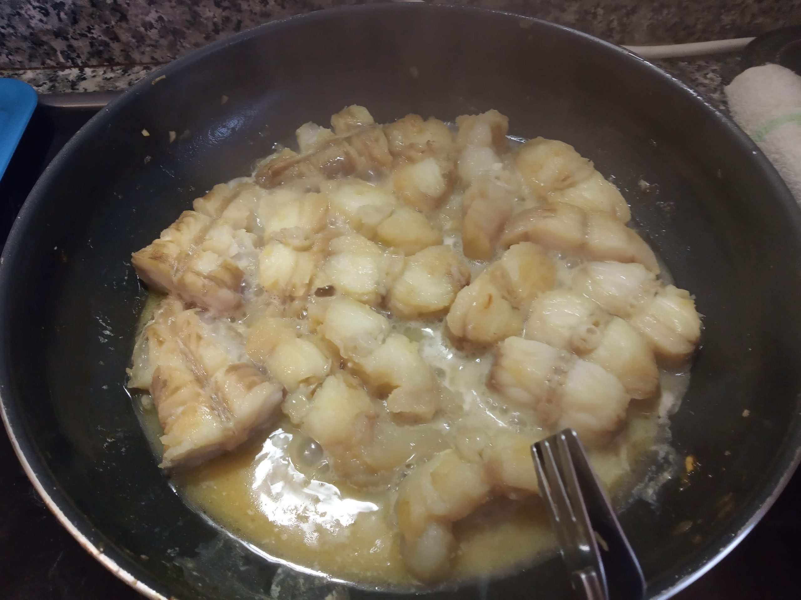 En la misma sarten, añadir un poco de aceite, y refreír el rape con un poco de sal y si quieres pasarlo por harina.